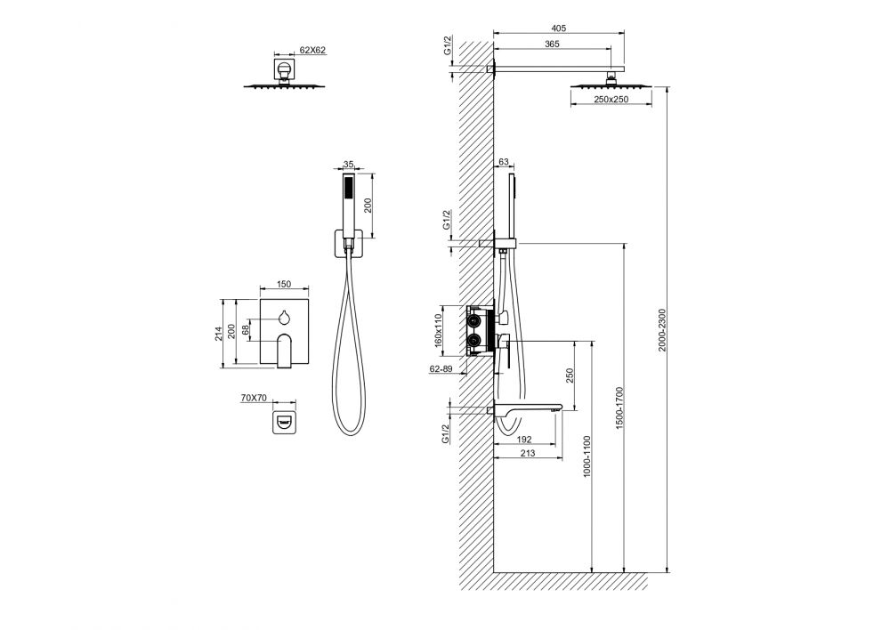 смеситель из латуни на 3 потребителя; картридж citec 35 мм, испания; декоративная пластина 3мм из нерж.; кронштейн для верхнего душа 400мм из нерж.; верхний душ 250х250х2мм из нерж.; ручной душ из латуни на 1 режим струи; душевой шланг 1,5м из нерж. с защитой от перекручивания; латунный держатель ручного душа; латунный излив с аэратором neoperl; упакован в коробку, пленку из вспененного пвх