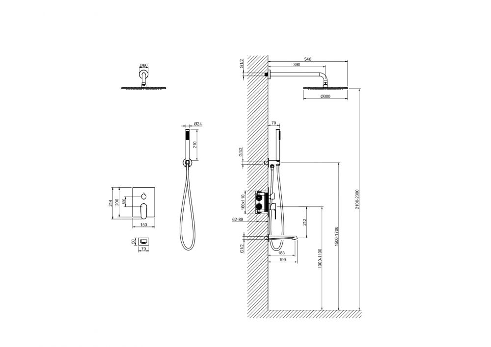 смеситель из латуни на 3 потребителя с установочной коробкой; картридж citec 35 мм, испания; декоративная пластина 3мм из нерж.; дивертор - керамический картридж; кронштейн для верхнего душа 400мм из нерж.; верхний душ 250х2мм из нерж.; латунный держатель ручного душа; ручной душ из латуни на 1 режим струи; душевой шланг 1,5м из нерж.; латунный излив с аэратором neoperl; упакован в коробку, пленку из вспененного пвх
