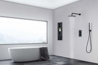 смеситель термостатический из латуни на 2 потребителя; картридж vernet, франция; декоративная пластина 3мм из нерж.; кронштейн для верхнего душа 400мм из нерж.; верхний душ 250х2мм из нерж.; душевой шланг 1,5м из нерж.; ручной душ из латуни на 1 режим струи; латунное шланговое соединение с держателем; упакован в коробку, пленку из вспененного пвх
