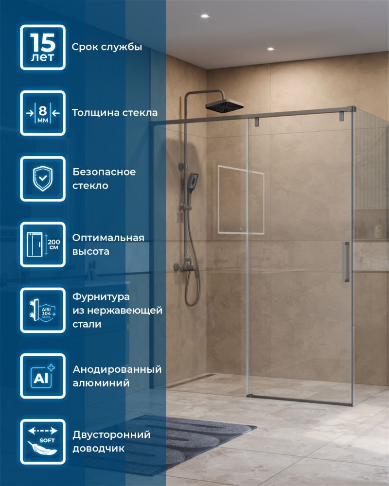 Душевой уголок BelBagno SOFT_CLOSE-1-AH-1-160/100-C-GM в размере 160x100 Цвет стекла прозрачное. Форма прямоугольная
