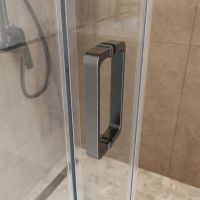 Коллекция сохраняет все преимущества минималистичного дизайна: минимум деталей, узкие профили и прозрачное стекло, которое не перегружает пространство, подчёркивая ощущение простора в ванной. Особая фишка — ролики увеличенного диаметра, обеспечивающие сверх плавное и бесшумное скольжение стеклянной панели без малейших усилий. Эти крупные элементы визуально доминируют, добавляя ограждению нотку надёжности и индустриальной эстетики в минималистичном стиле. Благодаря им ощущается лёгкость движения двери, усиливающая общее впечатление роскоши и стабильности, будто конструкция парит.