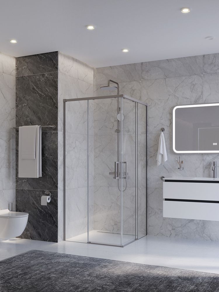 PLANE-A-2-100-C-IN Душевой уголок, отделка Сатин без поддона в размере 100x100. Прозрачное стекло толщиной 6мм. Цвет профиля сатин