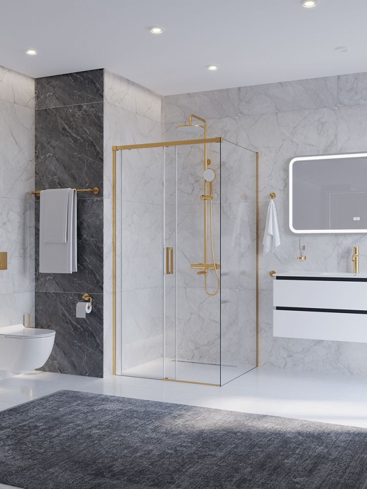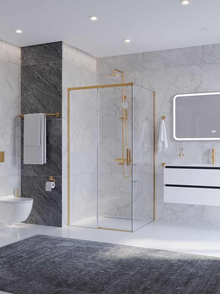 PLANE-AH-1-100/90-C-BORO Душевой уголок без поддона в размере 100x90. Прозрачное стекло толщиной 6мм. Цвет профиля брашированное золото