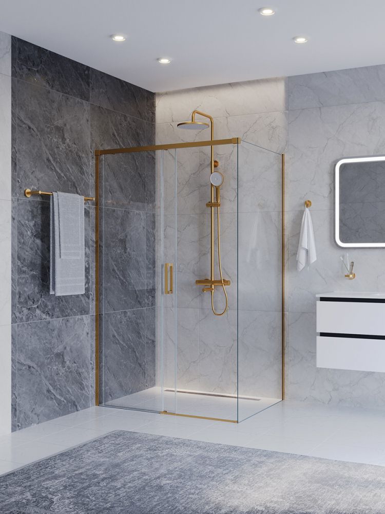 PLANE-AH-1-120/80-C-BORO Душевой уголок без поддона в размере 120x80. Прозрачное стекло толщиной 6мм. Цвет профиля брашированное золото