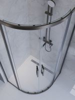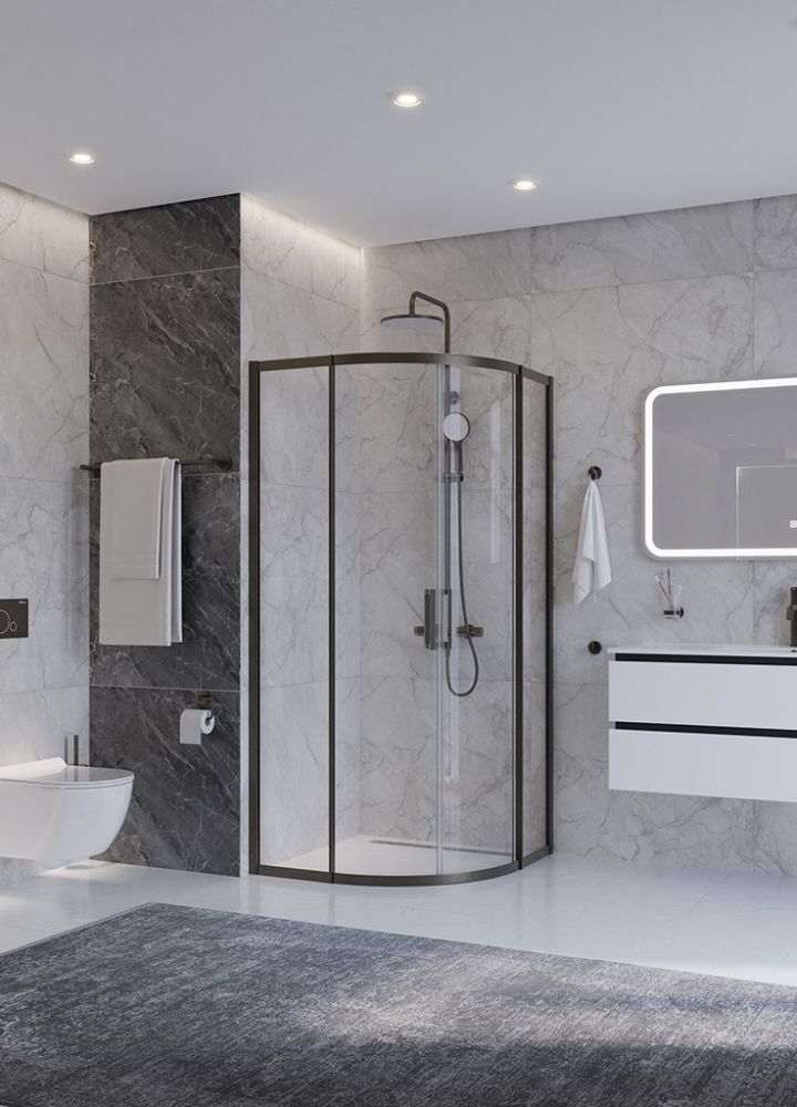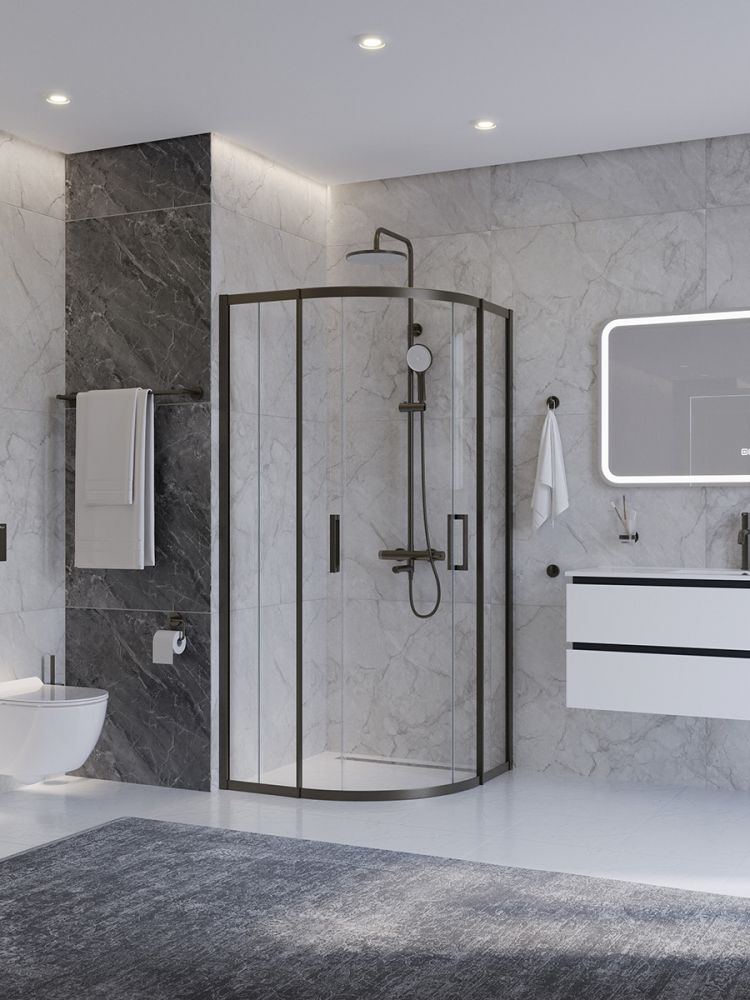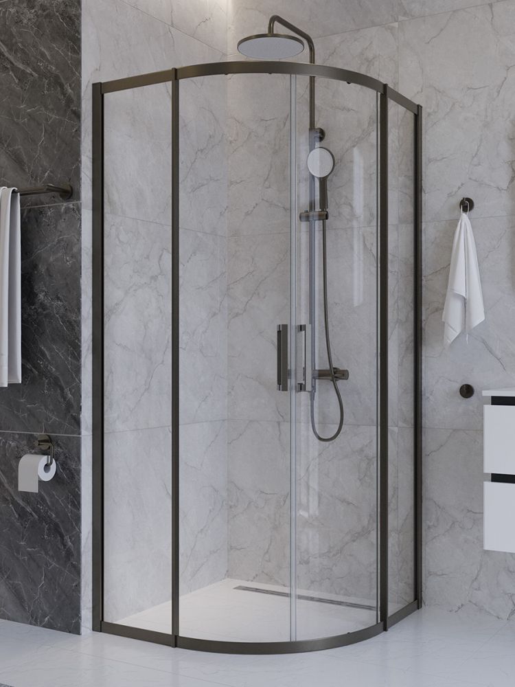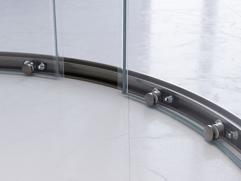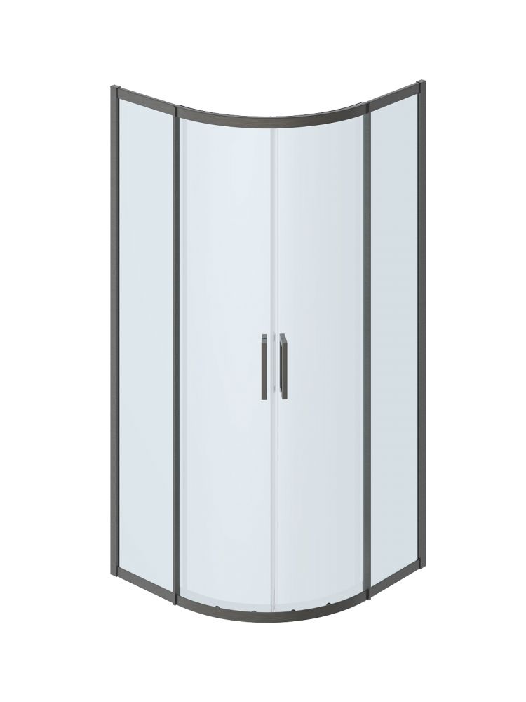 PLANE-R-2-90-C-GM Душевой уголок, отделка Оружейная сталь без поддона в размере 90x90. Прозрачное стекло толщиной 8мм. Цвет профиля оружейная сталь