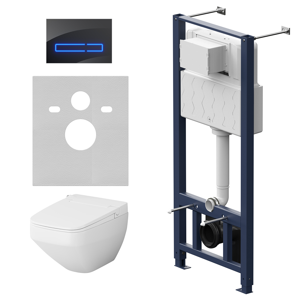 Полностью готовый к установке комплект: система инсталляции с клавишей подвесной унитаз с интегрированным электронным биде. Не разборная рама из стального профиля выдерживает нагрузку до 400 кг. Полностью изолированный бачок с качественной двухрежимной смывной арматурой - комфортное использование благодаря низкому уровню шума - менее 20 Дб. Укомплектован сенсорной клавишей в черном цвете. В комплекте все необходимые патрубки и крепления а также прокладка между унитазом и стеной - звукоизоляция. Экстраординарная комбинация премиальных функций – унитаз отмеченный премиями в области дизайна теперь с ультратонкой электронной крышкой-биде. Электронная крышка-биде оснащена технологией TouchReel позволяющей плавным поворотом настраивать напор воды и менять положение форсунки. Вы также можете изменять настройки с помощью пульта управления. Сиденье с микролифтом и быстросъемной крышкой. Впервые на рынке: сидение из прочного устойчивого к царапинам и сохраняющего безупречный белый цвет материала Дюропласт дополнено функцией подогрева. FlashClean — новое поколение безободковых унитазов без использования пластика: 100 % гигиеничности 0% брызг.