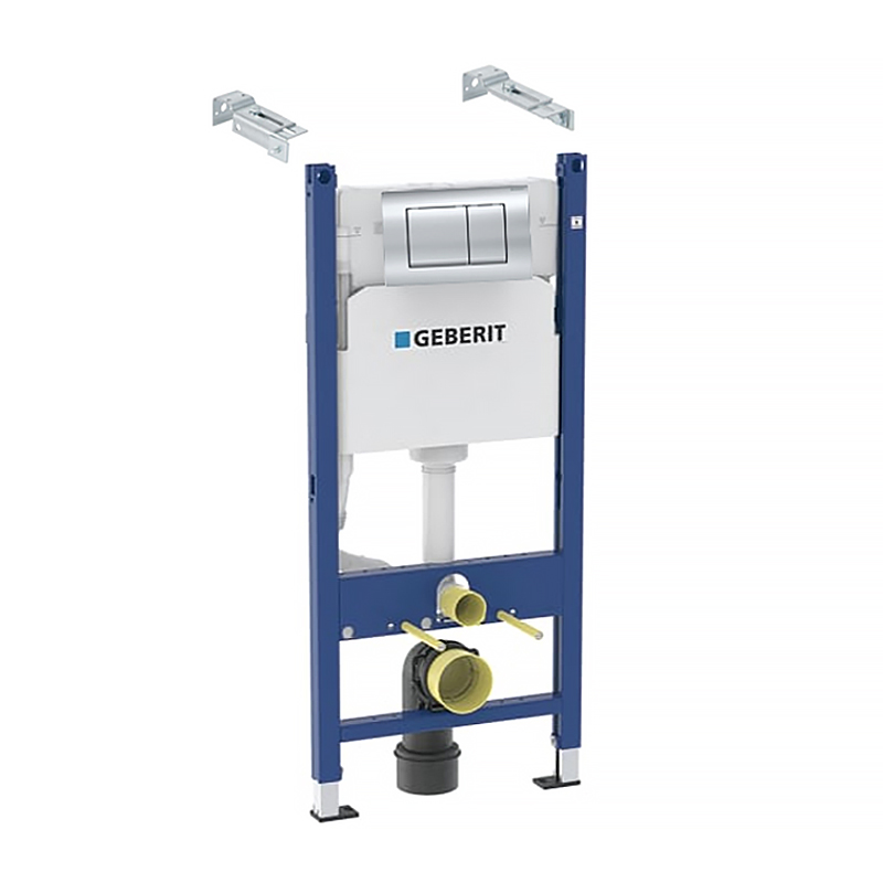 Рама с порошковой окраской Ножки с возможностью регулировки высоты до 20 см Глубина опорных площадок подходит для монтажа в U-образные профили UW 50 Смывной бачок скрытого монтажа с фронтальной установкой и с противоконденсатной изоляцией Подвод воды сзади или сверху по центру Угловой запорный вентиль R 1/2" с кольцом-адаптером Защитная крышка для окна технического обслуживания из пенополистирола Комплект для подключения унитаза, ø 90 мм Переходная муфта из ПНД, ø 90/110 мм Соединительное колено 90° из ПНД, ø 90 мм Соединительное колено может монтироваться без использования инструментов 2 держателя крепления рамки 2 защитных заглушки 2 резьбовые шпильки M12 Крепления к стене 2 анкера для крепления к стене Клавиша смыва Geberit Delta01 хром глянцевый с прямоугольными кнопками Механическая клавиша с большим и малым смывом Клавиша выполнена из пластика