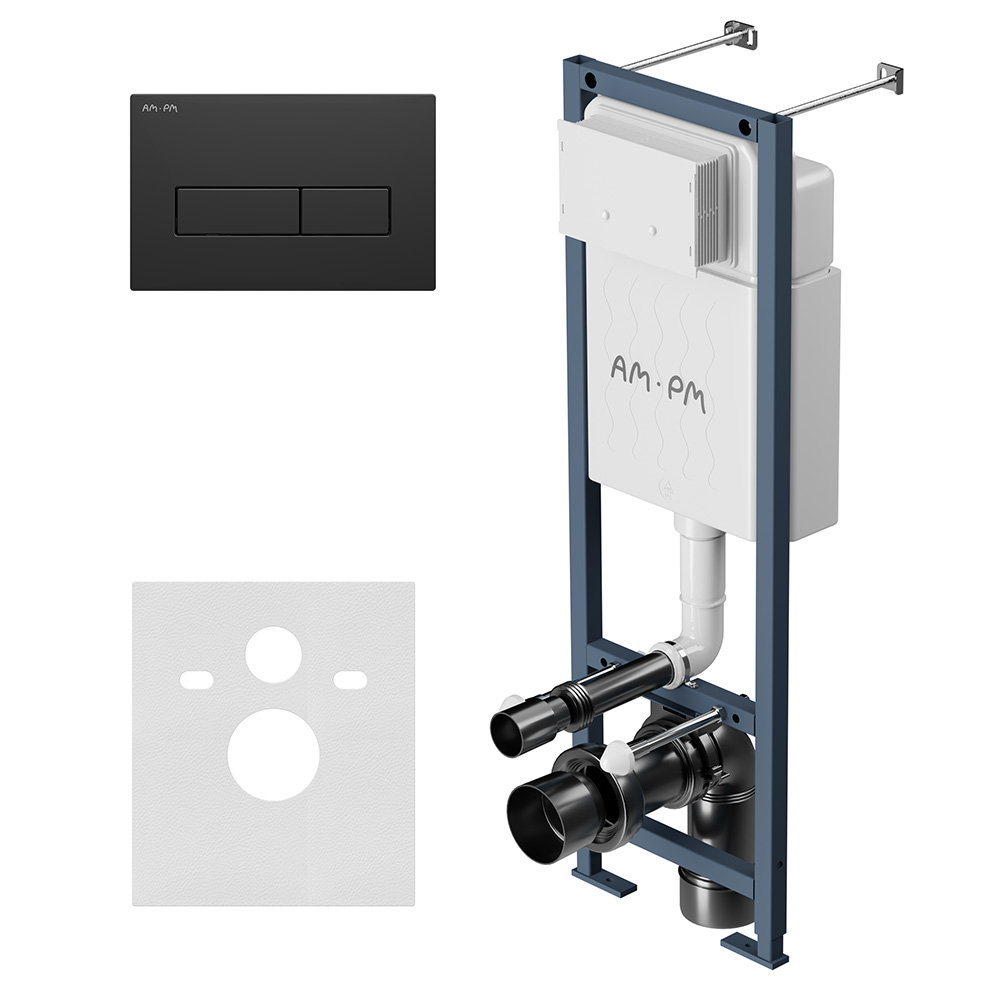 Максимально полный комплект поставки включающий все необходимые крепления патрубки звукоизолирующую прокладку. Экономия пространства благодаря узкой раме – 352 мм шириной. Подходит даже для самых малогабаритных ванных комнат. Заливной клапан с низким уровнем шума - Класс II согласно европейского стандарта EN 14124. Выдерживает нагрузку до 400 кг. Подходит для унитазов любых размеров. Высокая прочность и износостойкость. Увеличенная толщина профиля двойные прокладки слива и подачи воды. Подключение воды сзади сверху. В комплекте механическая двухрежимная клавиша из ABS пластика матовый черный ""