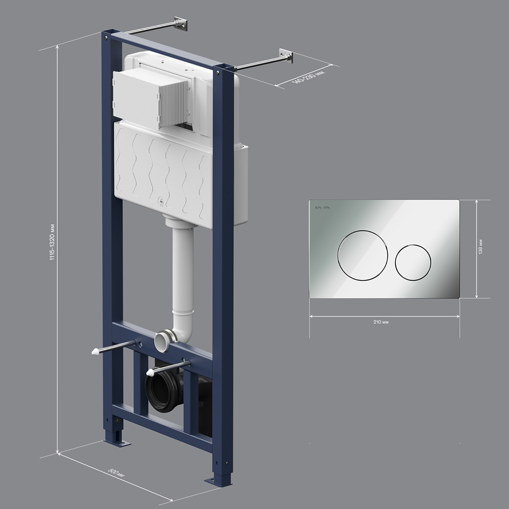 Максимально полная комплектация - все необходимые крепления, патрубки, звукоизолирующая прокладка в комплекте. Вертикальные ребра жесткости в конструкции рамы – дополнительная опора в месте давления керамики на стену.