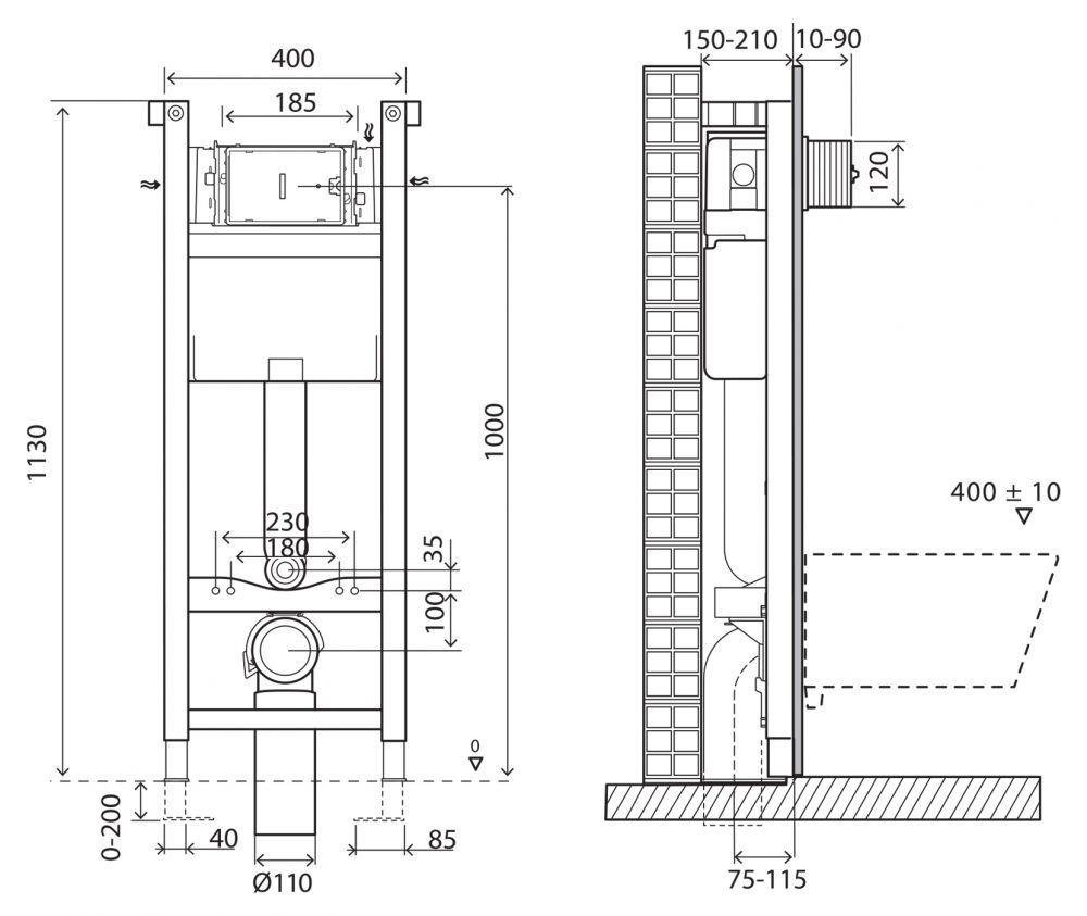 Инсталляция BelBagno EXPERT 40 для подвесного унитаза, 1130х400х150 мм, со смывным бачком скрытого монтажа, фронтальное/горизонтальное управление, крепление к стене в комплекте