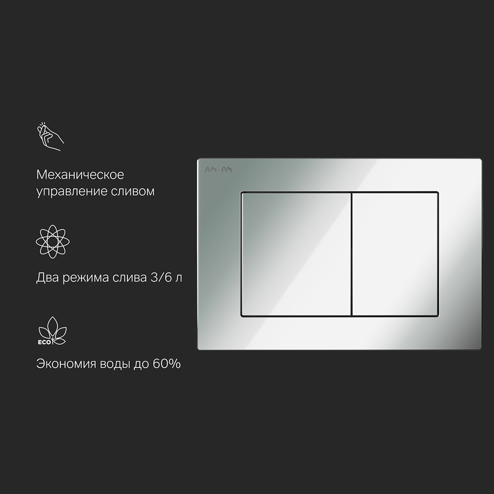 Двойной смыв - 3/6 л. Механический принцип работы все крепления в комплекте. Клавиша подходит для инсталляции AM.PM PrimeFit I012709.