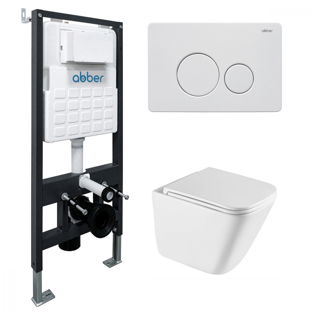 Комплект подвесной унитаз ABBER Rechteck AC1219TC белый, с закрытым дном с инсталляцией AC0105 и кнопкой AC0121MW белая матовая