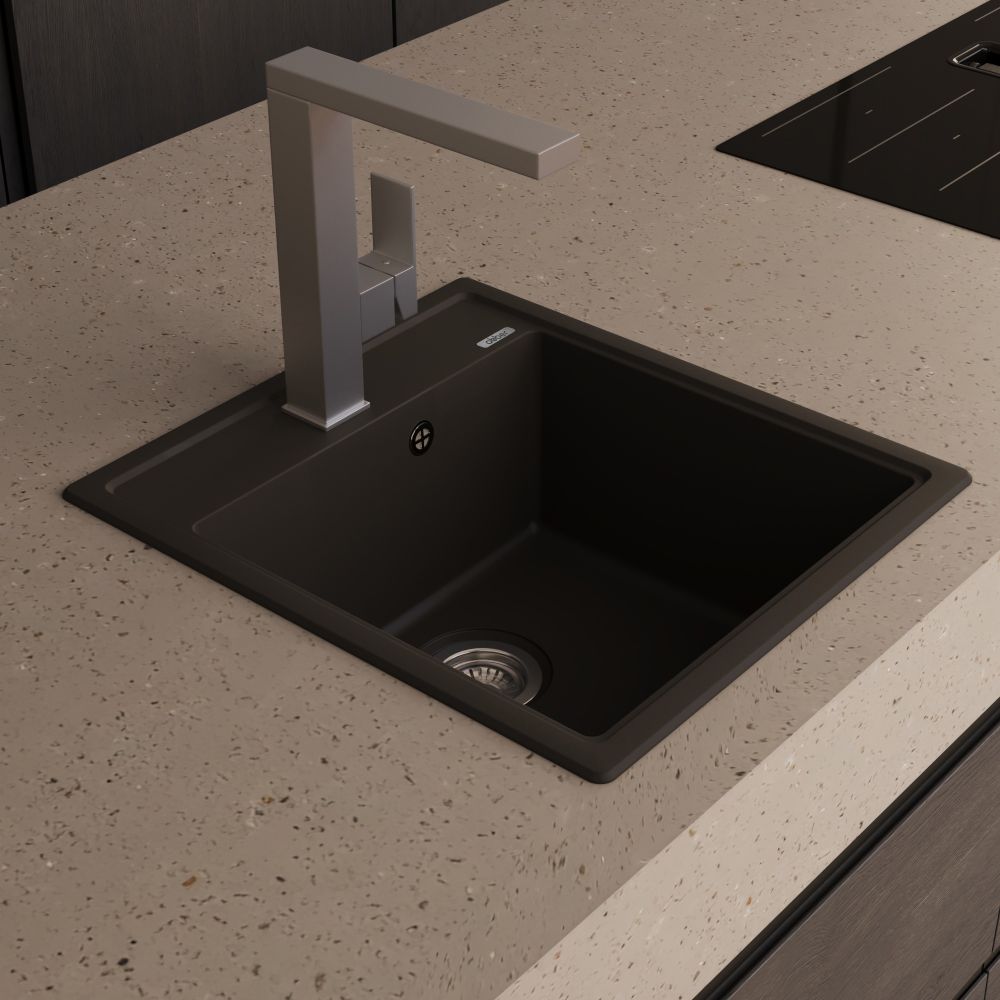 Кухонная мойка ABBER Quarz AQ2901B черная, материал изготовления кварцевый композит. Корзинчатый вентиль идет в комплекте.