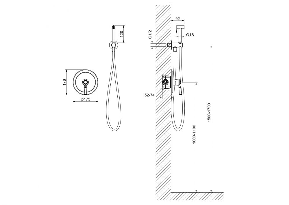 смеситель из латуни с установочной коробкой; ручка из латуни и цинкового сплава; картридж citec 35 мм, испания; декоративная пластина толщиной 1,2мм из латуни; латунный гигиенический душ; душевой шланг 1,2м из нерж.; латунный держатель для душа