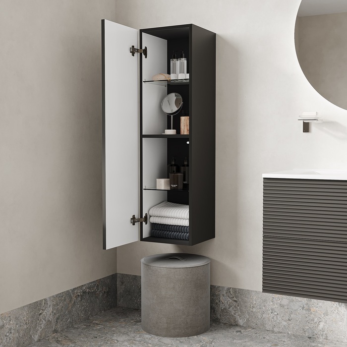 Подвесной пенал для ванной комнаты Bild – красивый дизайн с вертикальной фрезеровкой в сочетании с популярным темно-серым цветом, удобством и практичностью. Универсальная ориентация: пенал можно подвесить так, чтобы дверки открывались в удобную вам сторону (пенал можно перевернуть на 180 градусов, при этом перевешивать дверцы не нужно). • Материал фасадов – МДФ с покрытием ПВХ-пленкой. Она разработана для использования в помещениях с высокой влажностью и сохранит первоначальный вид мебели надолго (при должном уходе). Материал боковин – МДФ. • Стеклянные полки (толщина 5 мм) надежно фиксируются специальными креплениями, что предотвращает риск их случайного повреждения. • Можно самостоятельно выбрать, куда будет открываться дверка: корпус пенала оборачиваемый, поэтому универсальный. • Современный механизм открытия Push-to-Open – открывается нажатием на фасад. • Надежная фурнитура рассчитана на более 10 лет исправной работы. • В комплекте крепеж для монтажа пенала. Гарантия на мебель IDDIS® – 3 года. (с) Авторский текст, октябрь 2024 г.