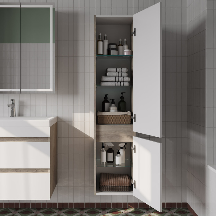 Подвесной пенал для ванной комнаты Zodiac – удобство и практичность в сочетании с лаконичным скандинавским дизайном. Универсальная ориентация: пенал можно подвесить так, чтобы дверки открывались в удобную вам сторону (пенал можно перевернуть на 180 градусов, при этом перевешивать дверцы не нужно). • Продуманное хранение: в большом верхнем отсеке две стеклянных полки, в маленьком нижнем – одна с возможностью регулировки по высоте. • Корпус сделан из влагостойкой ЛДСП в уютном цвете «ясень-шимо», фасад – из влагостойкой ЛДСП, покрыты несколькими слоями белоснежной эмали. Такое качественное исполнение обеспечит долгий срок службы мебели во влажном помещении ванной (при соблюдении рекомендаций по уходу). • Дверцы с механизмом плавного доведения закрываются плавно и бесшумно. Интегрированные ручки. Фурнитура рассчитана на 30 000 открываний, что составляет более 10 лет исправной работы. Гарантия на мебель IDDIS® – 3 года. (с) Авторский текст, апрель 2023 г.