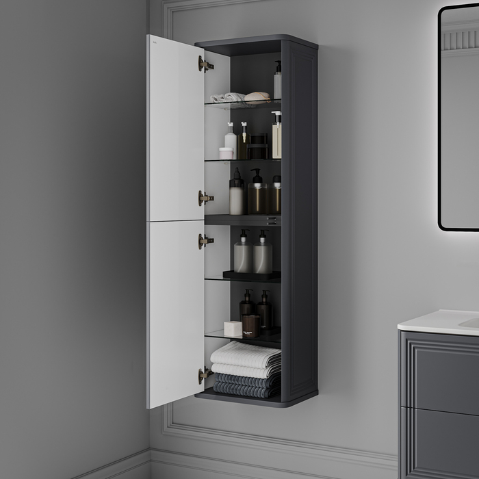 Подвесной пенал для ванной комнаты Oxford Neo в элегантном стиле нео-классика с изящной фрезеровкой на фасадах и торцах. Универсальная ориентация: пенал можно подвесить так, чтобы дверки открывались в удобную вам сторону (пенал можно перевернуть на 180 градусов, при этом перевешивать дверцы не нужно). При желании пенал можно сделать напольным – ножки высотой 30 см продаются отдельно в трёх цветах (белый, чёрный и светлый бук). Материал фасадов и боковин – МДФ с покрытием тёмно-серой матовой эмалью (RAL7015). Продумано для использования в помещениях с высокой влажностью и сохранит первоначальный вид мебели надолго (при должном уходе). Стеклянные полки (толщина 5 мм) надёжно фиксируются специальными креплениями, что предотвращает риск их случайного повреждения. Можно самостоятельно выбрать, куда будет открываться дверка: корпус пенала оборачиваемый, поэтому универсальный. Современный механизм открытия Push-to-Open – дверки открываются нажатием на фасад. Надежная фурнитура Hettich рассчитана на 30 000 открываний – это более 10 лет исправной работы. В комплекте навесы Hettich для удобного монтажа пенала. Гарантия на мебель IDDIS® – 3 года. (с) Авторский текст, август 2025 г.