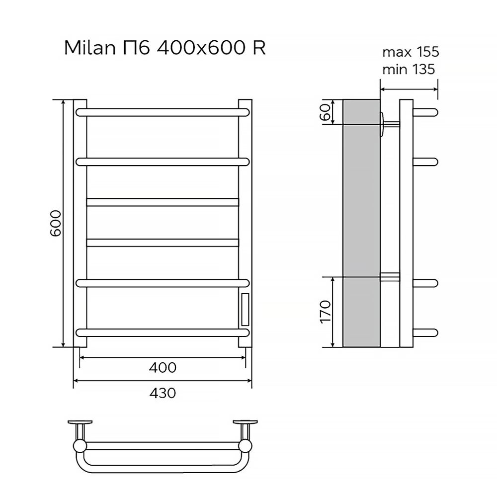 Полотенцесушитель электрический AZARIO MILAN 400/600 6 секций, диммер справа, черный (AZ90846B)