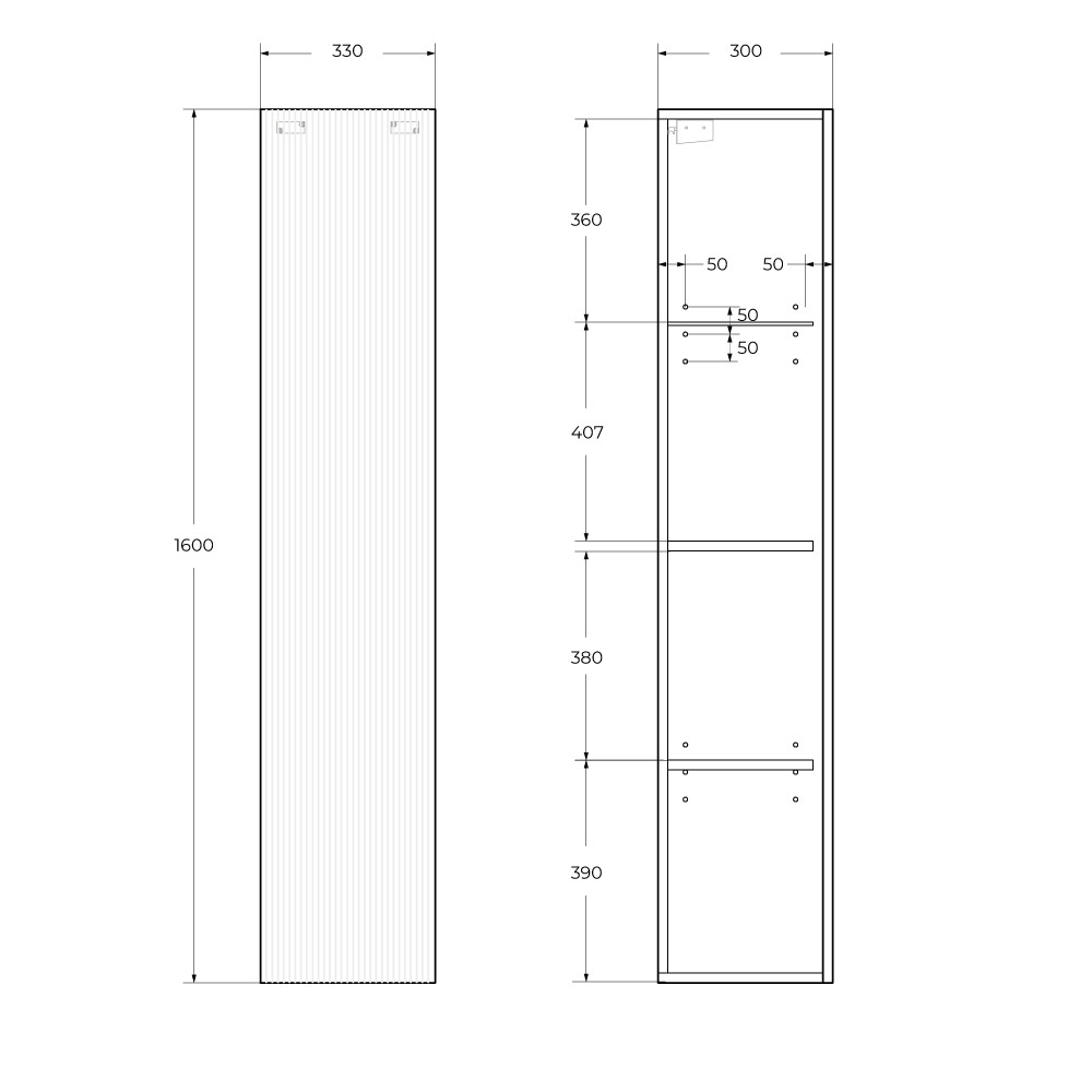 UNO Шкаф подвесной с фрезерованной ручкой с торца фасада с одной распашными дверцей доводчиками, с двумя полками, универсальный, 330x300x1600мм, Бежевый матовый, UNO-1600-1A-SC-CO
