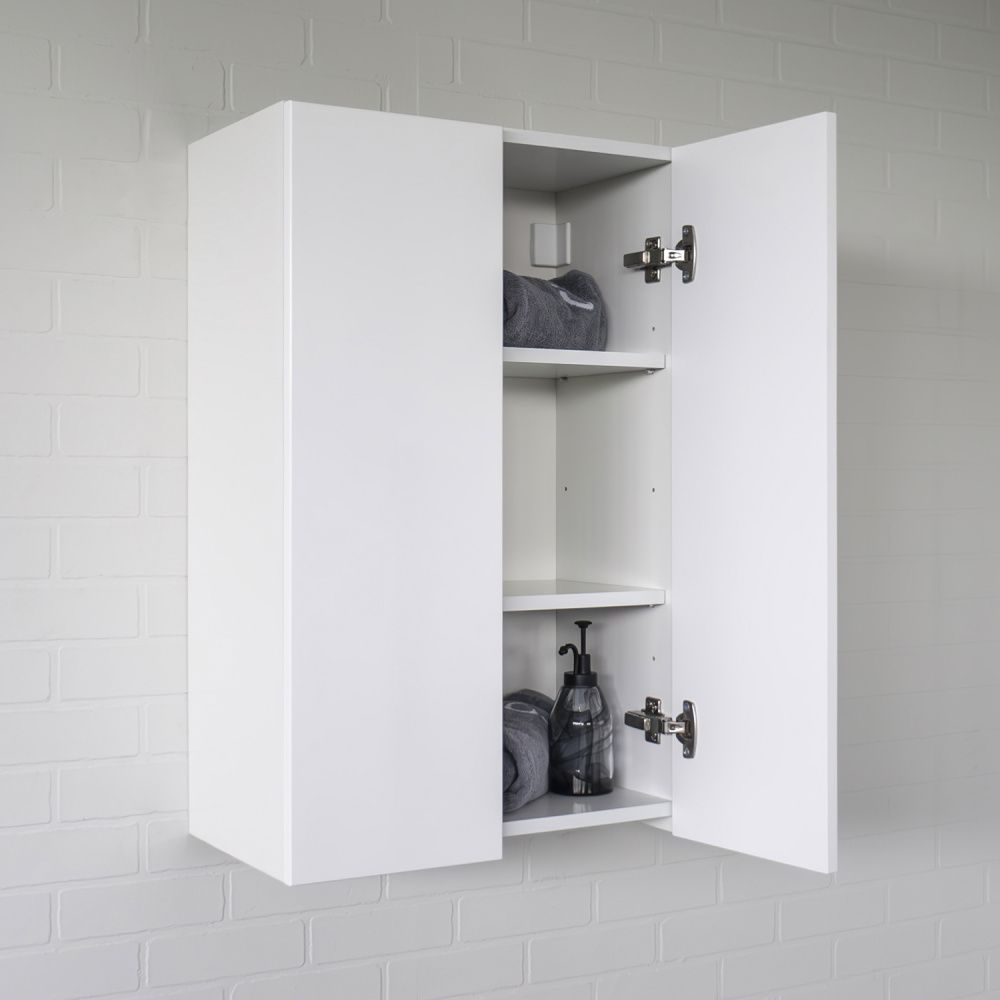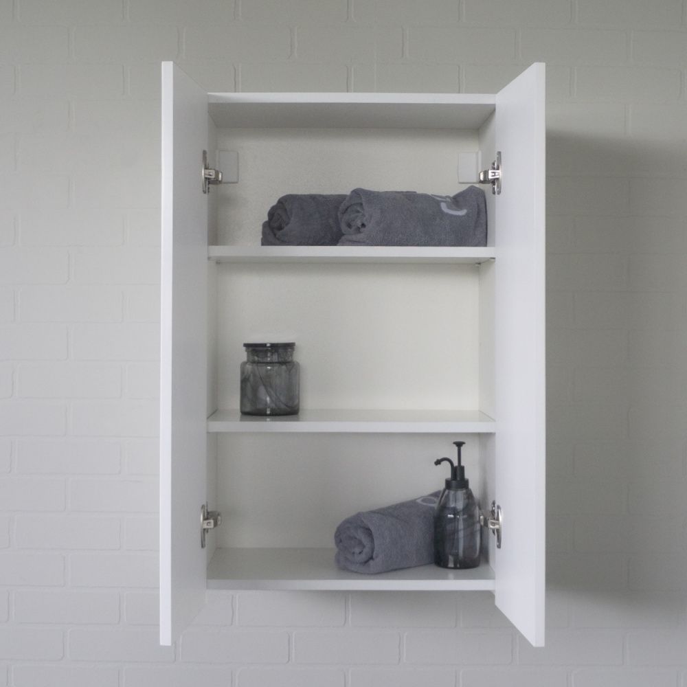 Назначение: Шкаф подвесной Производитель: Comforty Артикул: 00-00017833CF Варианты цвета: белый глянец Материал корпуса: влагостойкое ЛДСП Материал корпуса: МДФ Габариты (ШхВхГ): 500*800*300 мм Универсальный подвесной шкаф может использоваться как в ванной комнате, так и в других помещениях. Это отличное решение для хранения разных предметов. За створками две горизонтальные полки. Петли с механизмами плавного закрывания.