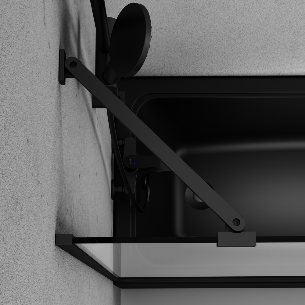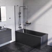 Фиксированная шторка на борт ванны в новом стильном черном цвете профиля в сочетании с прозрачным стеклом.