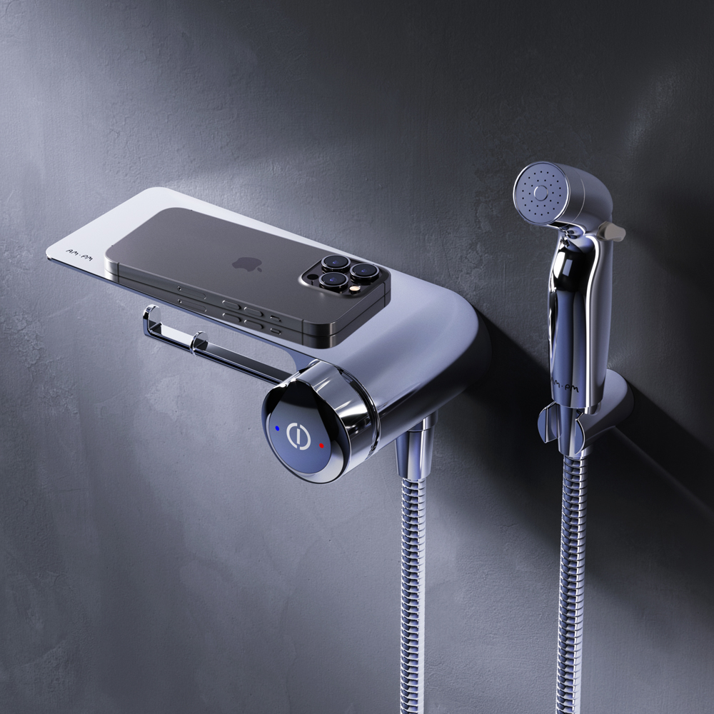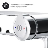 Первая в мире коллекция нажимных смесителей для ванной комнаты была создана в рамках коллекции X-Joy всемирно известным дизайн-бюро GP designpartners Австрия. Интуитивная понятная система управления TouchReel для включения/выключения смесителя одним нажатием. Максимально простое управление температурой воды для тех кто не хочет ничего настраивать. Весь продукт представляет собой удобную полочку на которой можно разместить все что необходимо вам под рукой. На интегрированном держателе можно размещать туалетную бумагу а на крючке - полотенце.