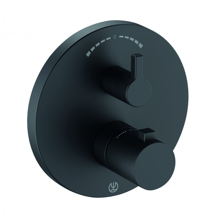 Встраиваемый смеситель для душа Kludi Nova Fonte Puristic 208303915 с термостатом. Характеристики: Цвет: черный матовый. Материал: латунь. Монтаж: скрытый. Расход воды: 20 л/мин при давлении 3 бара. Механизм: керамический картридж с ограничителем горячей воды при 38°C и дополнительным ограничителем при 43°C. Переключатель душ/излив. В комплекте поставки: внешняя монтажная часть смесителя.