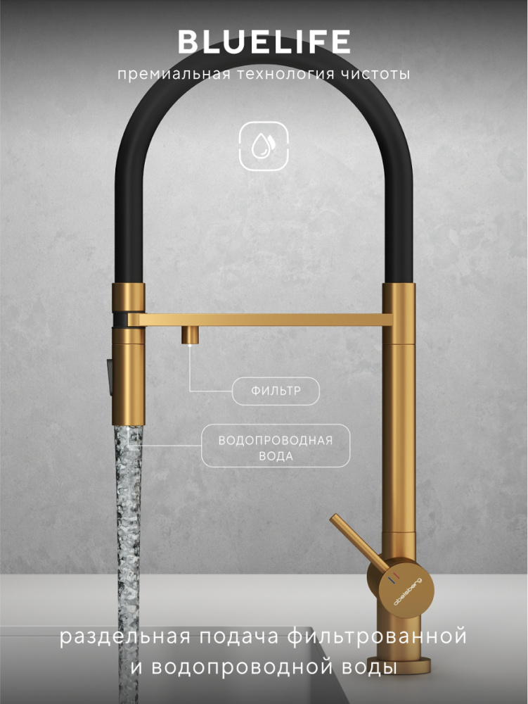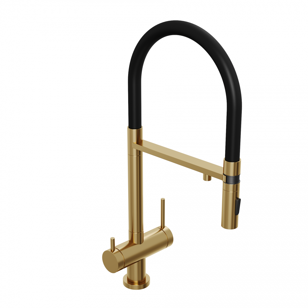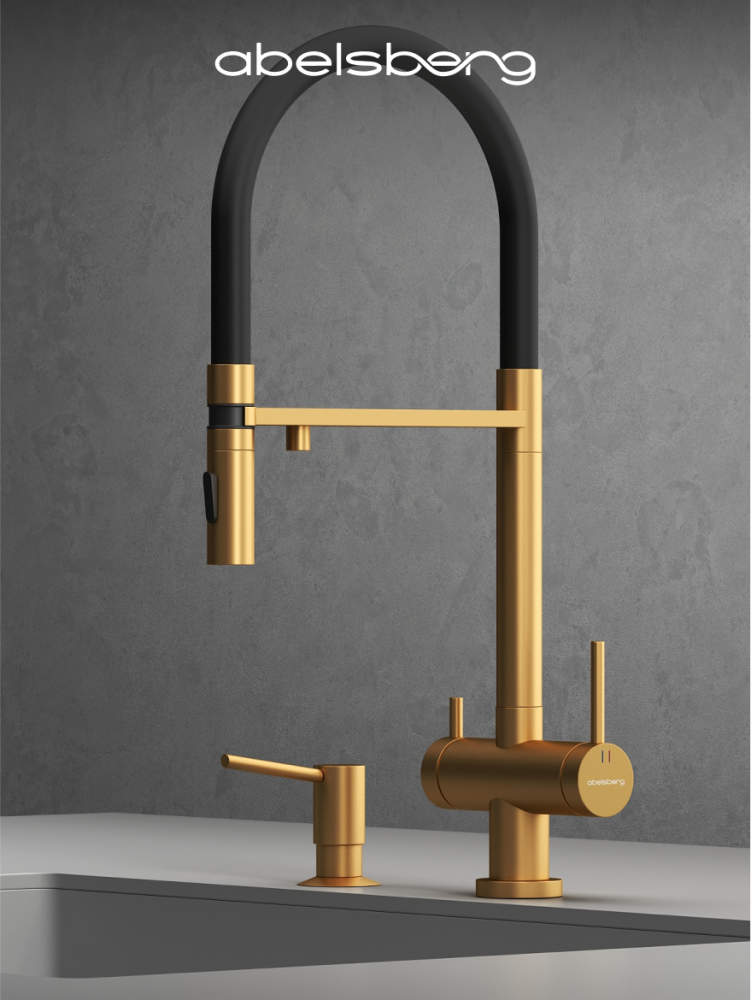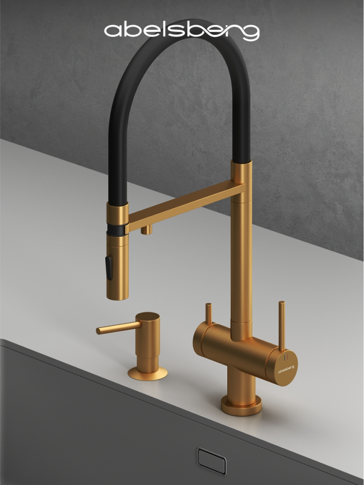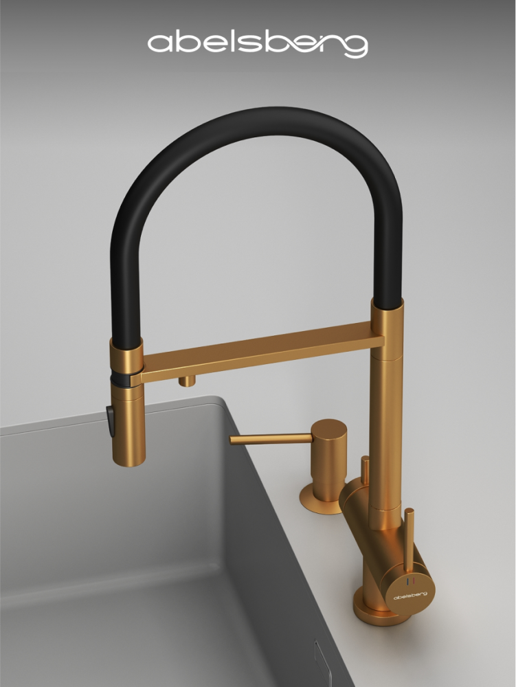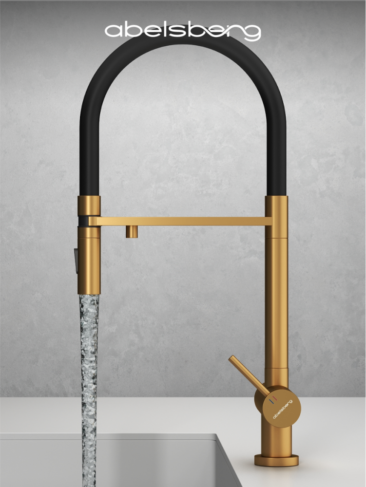 Смеситель для кухни ABELSBERG Venta c гибким изливом и возможностью подключения фильтра для воды, цвет королевское золото, PVD покрытие, арт. IXF73979BG