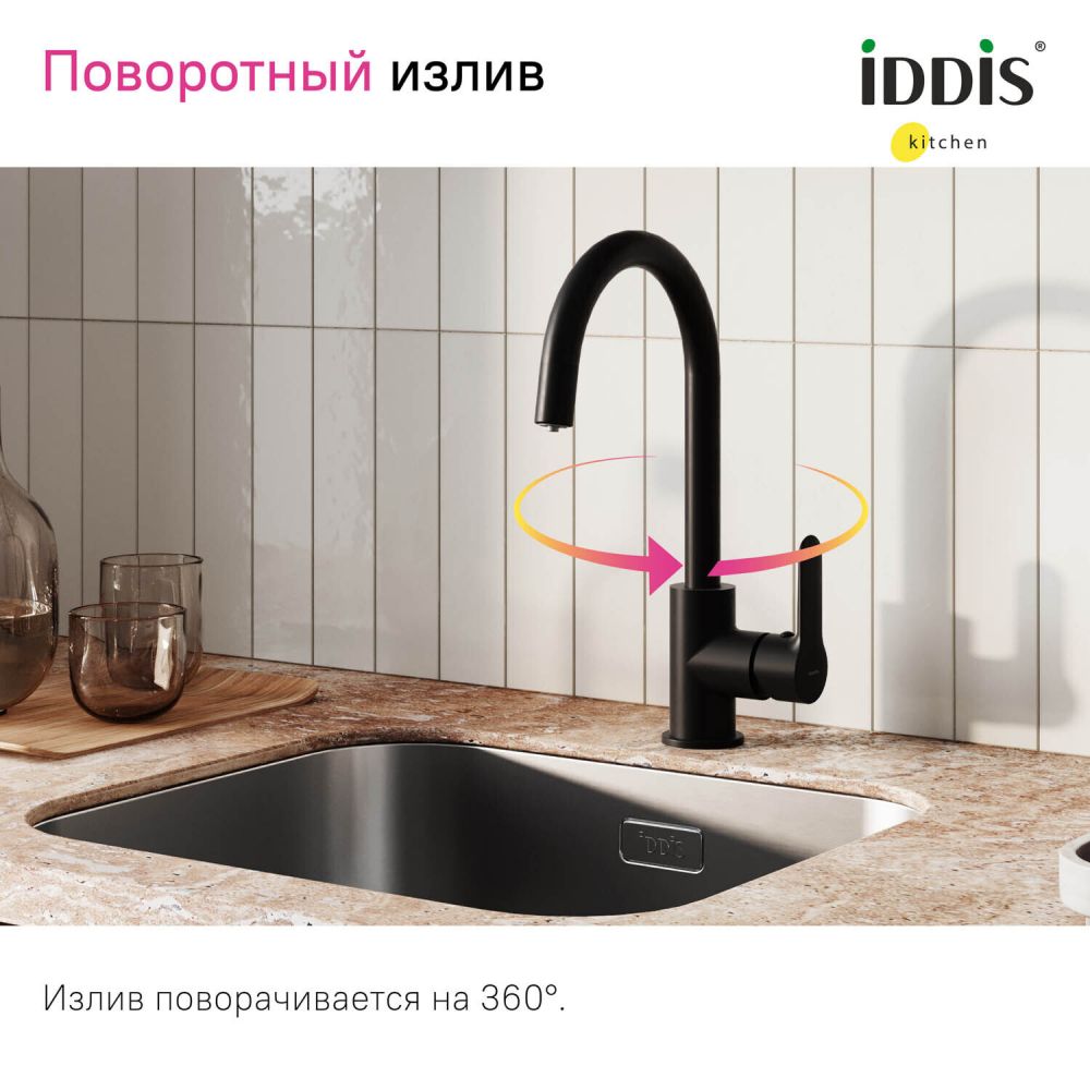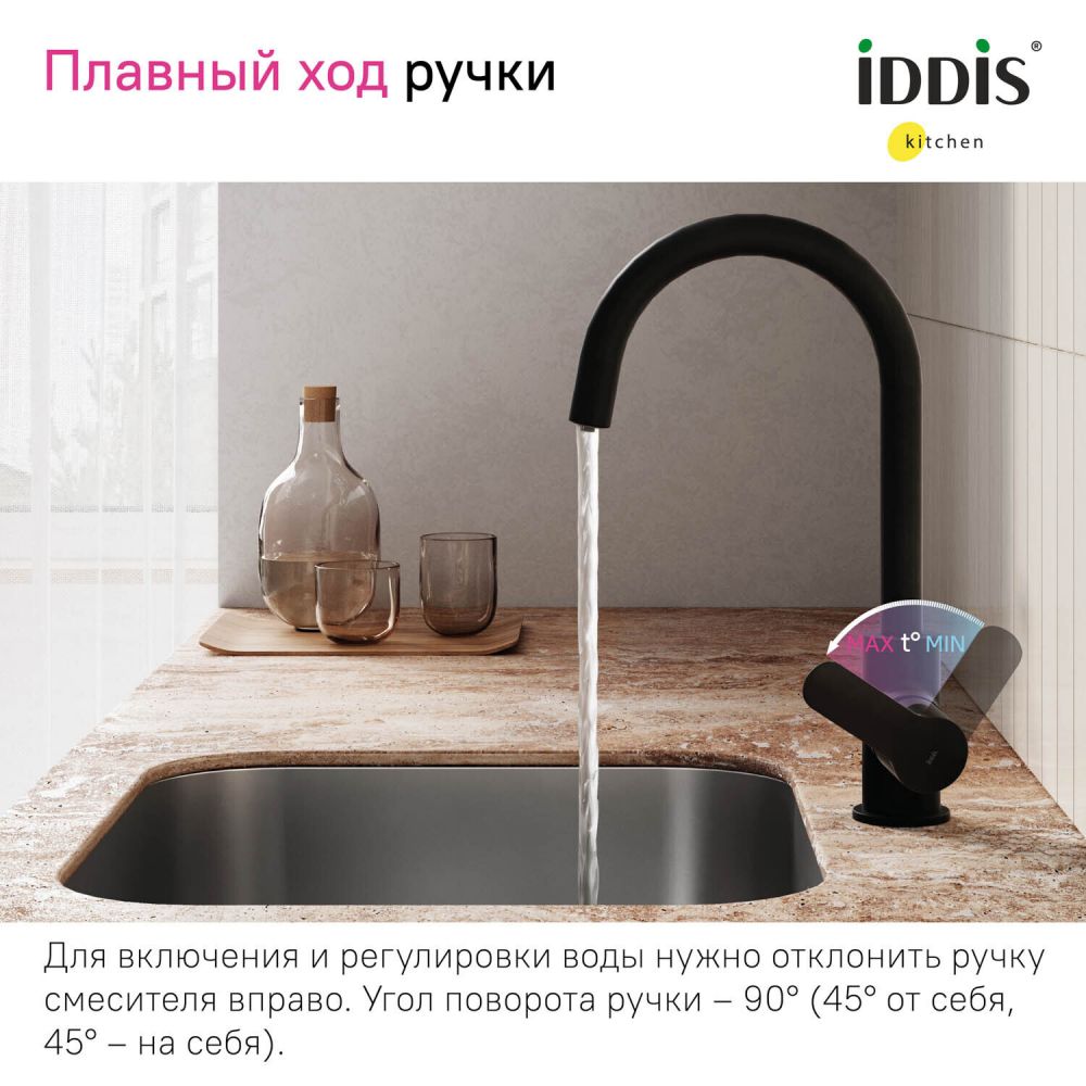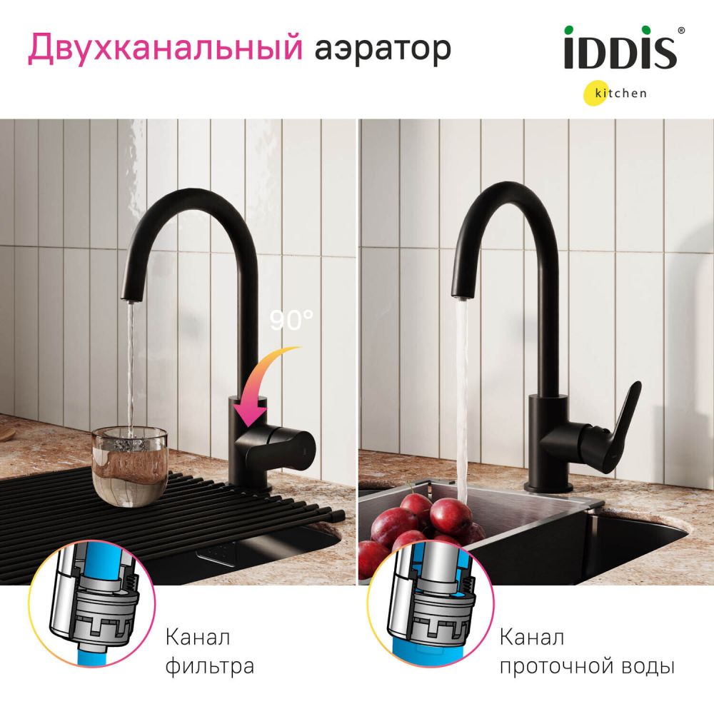 Смеситель для кухни с каналом для фильтрованной воды, черный, Cuba, IDDIS, CUBBLFJi05 в трендовом черном цвете с каналом для фильтрованной воды представляет уникальную технологию управления фильтрованной водой, которая практически не имеет аналогов. Теперь, чтобы налить стакан чистой воды, не нужна вторая ручка, — достаточно просто повернуть основную ручку в закрытом состоянии. Встроенный отдельный канал для фильтрованной воды позволяет, при подключении к любому фильтру, наслаждаться чистой питьевой водой прямо из смесителя. Нет необходимости устанавливать отдельный смеситель и сверлить под него отверстие. • Высокий поворотный излив делает смеситель более практичным. • Надежный корпус из прочной латуни с пониженным содержанием свинца — стойкий к коррозии, резким изменениям давления и перепадам температуры воды. • Плавный ход ручки и абсолютная точность регулировки температуры и напора воды — за счет качественного керамического картриджа Softap. • Гарантия на смесители IDDIS® – 10 лет. (с) Авторский текст, ноябрь 2020 г.