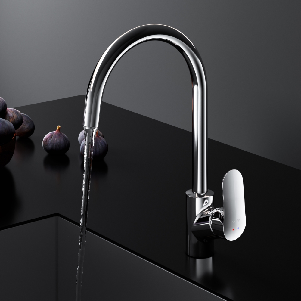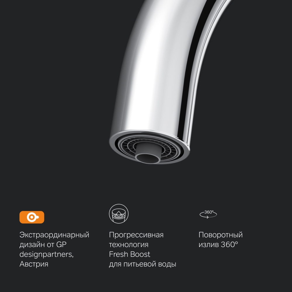 Кухонный смеситель АМ.РМ со встроенным каналом для питьевой воды успешно совмещает в себе два в одном. Благодаря прогрессивной технологии Fresh Boost при вращении ручки на 90 градусов вы можете наслаждаться чистой водой из фильтра. Если же Вам нужна обычная вода, смеситель управляется привычным способом. Также, конструкция, совмещающая в себе 2 в 1, экономит место и придаёт кухне опрятный вид без лишних элементов. Ультрамодный стиль смесителя - Dynamic Organic - это природные формы в сочетании с четкими линиями, доведенными до совершенства человеком.