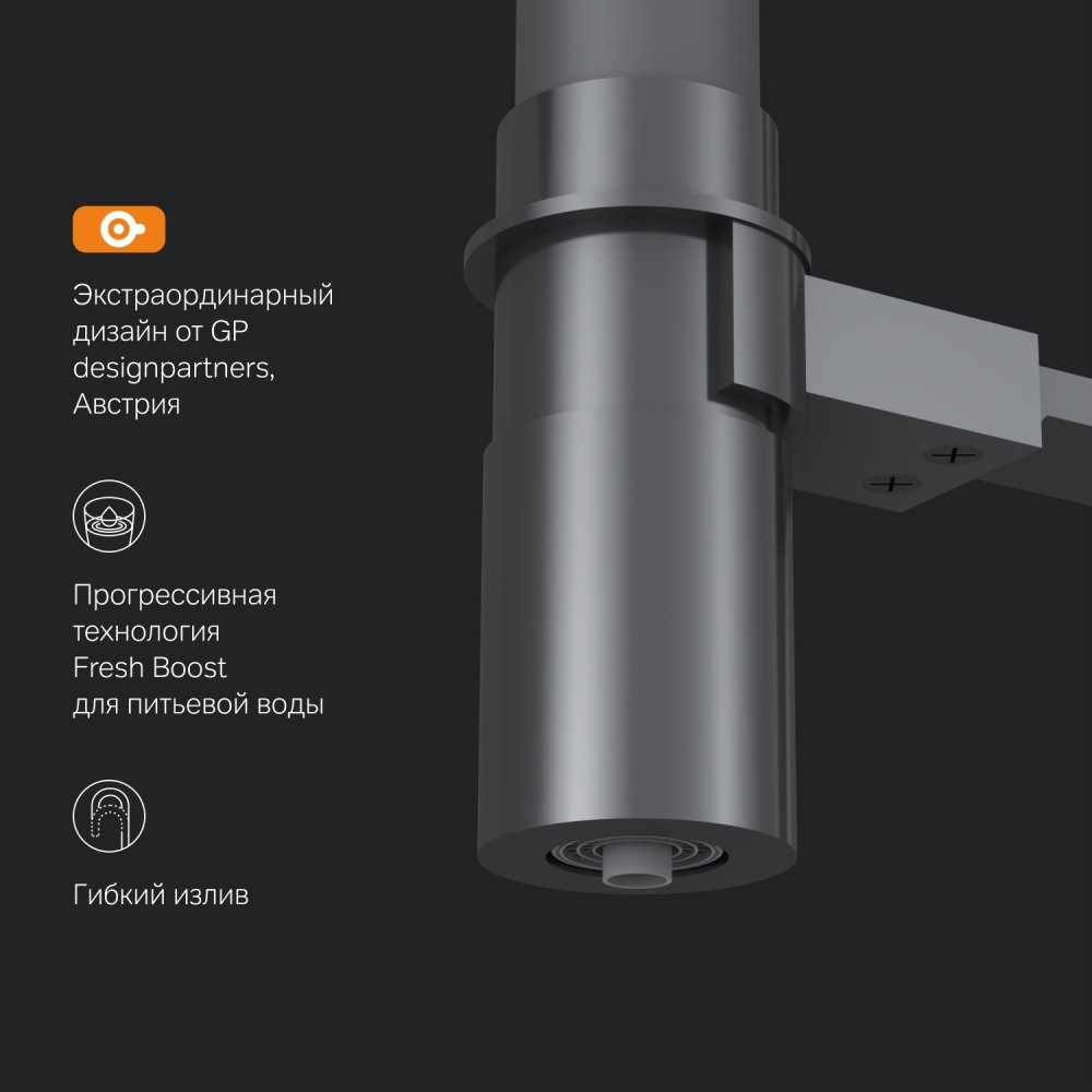 Безусловный лидер среди кухонных смесителей бренда – стильный и функциональный смеситель с профессиональным изливом и встроенным каналом для питьевой воды из культовой коллекции Like. Гибкий излив значительно расширяет зону использования смесителя гарантирует легкий уход за мойкой и наполнение емкостей любого размера. Излив устойчив к загрязнениям перегибам и внешним воздействиям. Удобный магнитный притягиватель для фиксации излива. Смеситель оснащен встроенным каналом для питьевой воды. Благодаря прогрессивной технологии Fresh Boost при вращении ручки на 90 градусов вы можете наслаждаться чистой питьевой водой. Для получения обычной воды просто управляйте смесителем привычным способом. Эксклюзивная разработка для АМ.РМ: специально спроектированный керамический картридж SoftMotion 35 мм обеспечивает низкий уровень шума выдерживает любые перепады давления в водопроводной сети. ""
