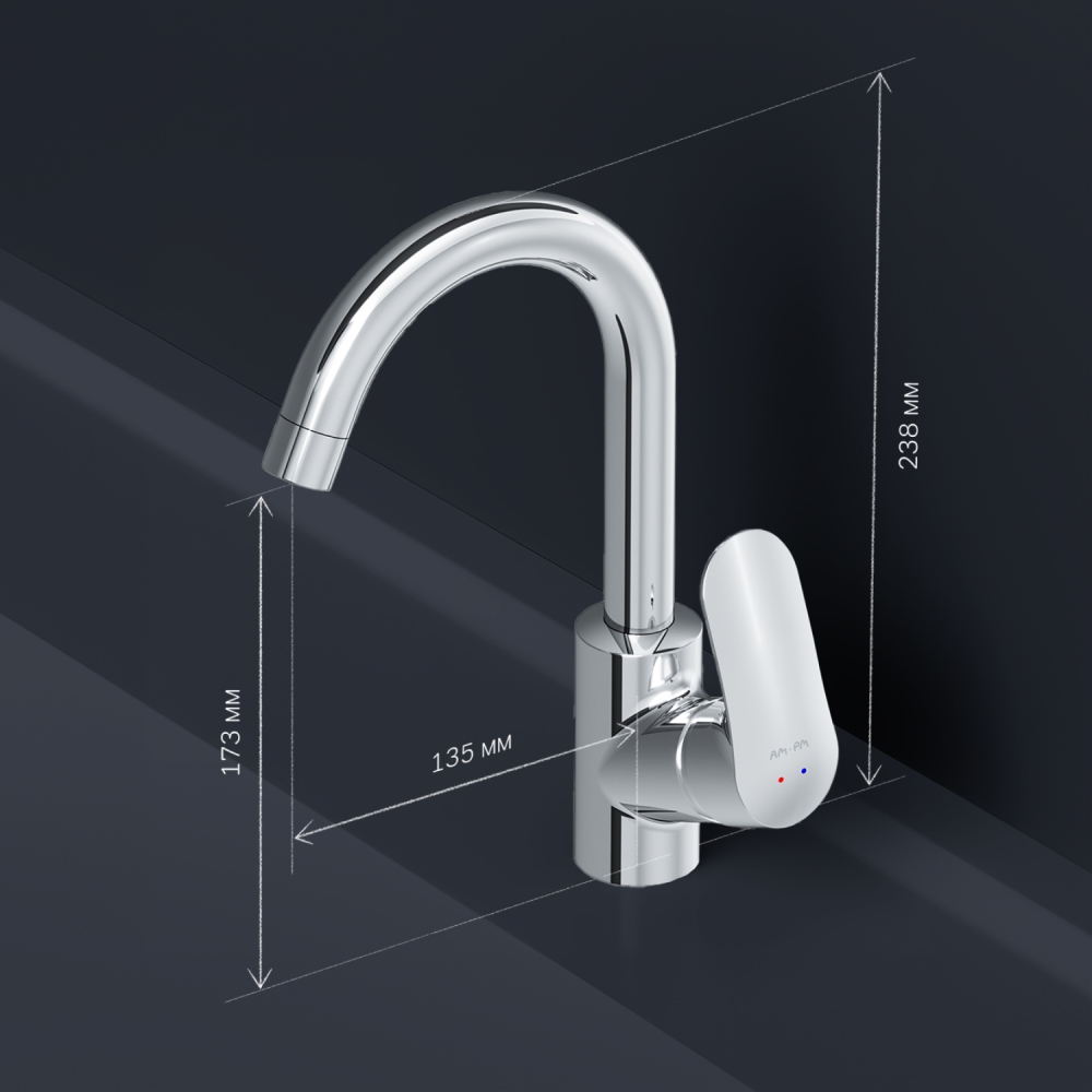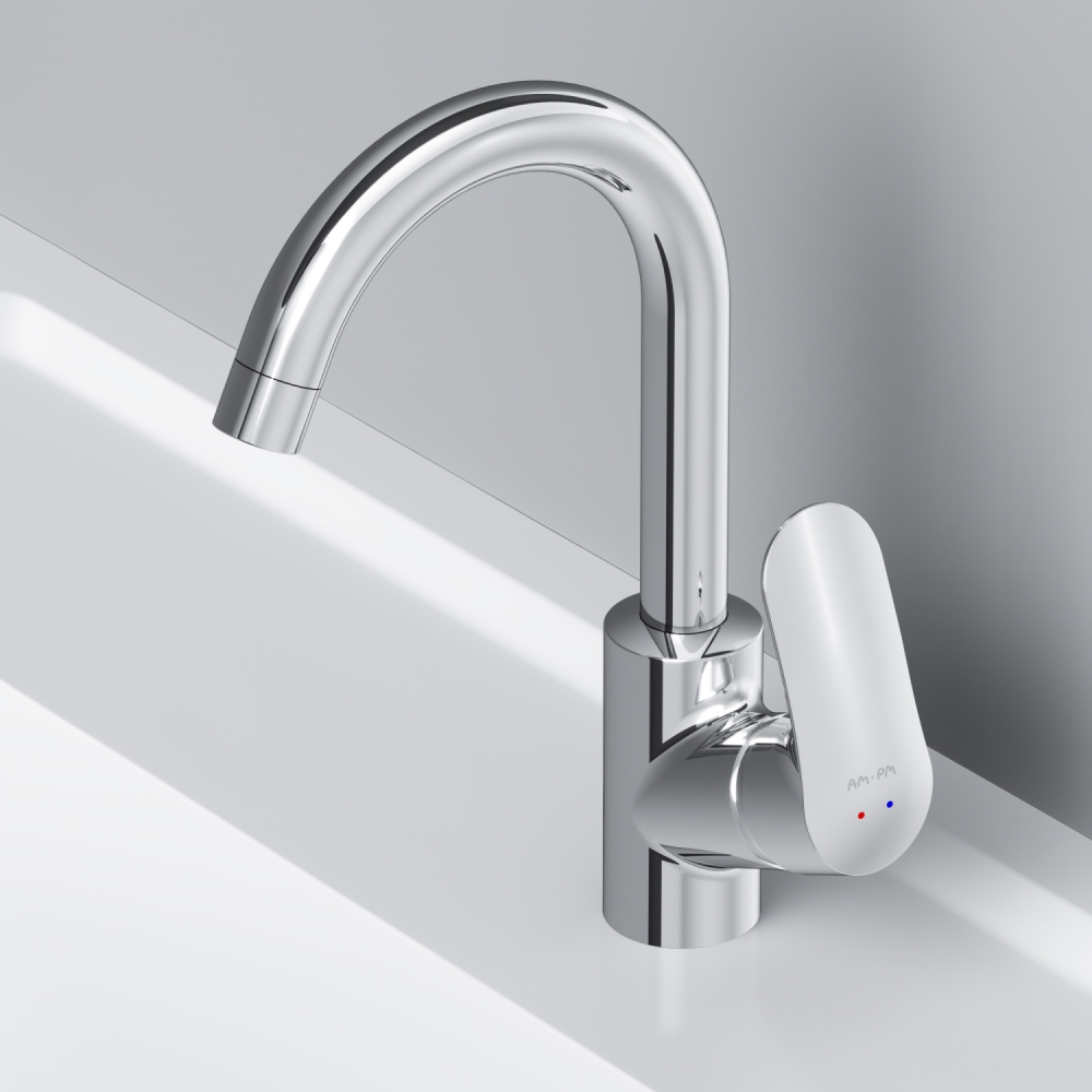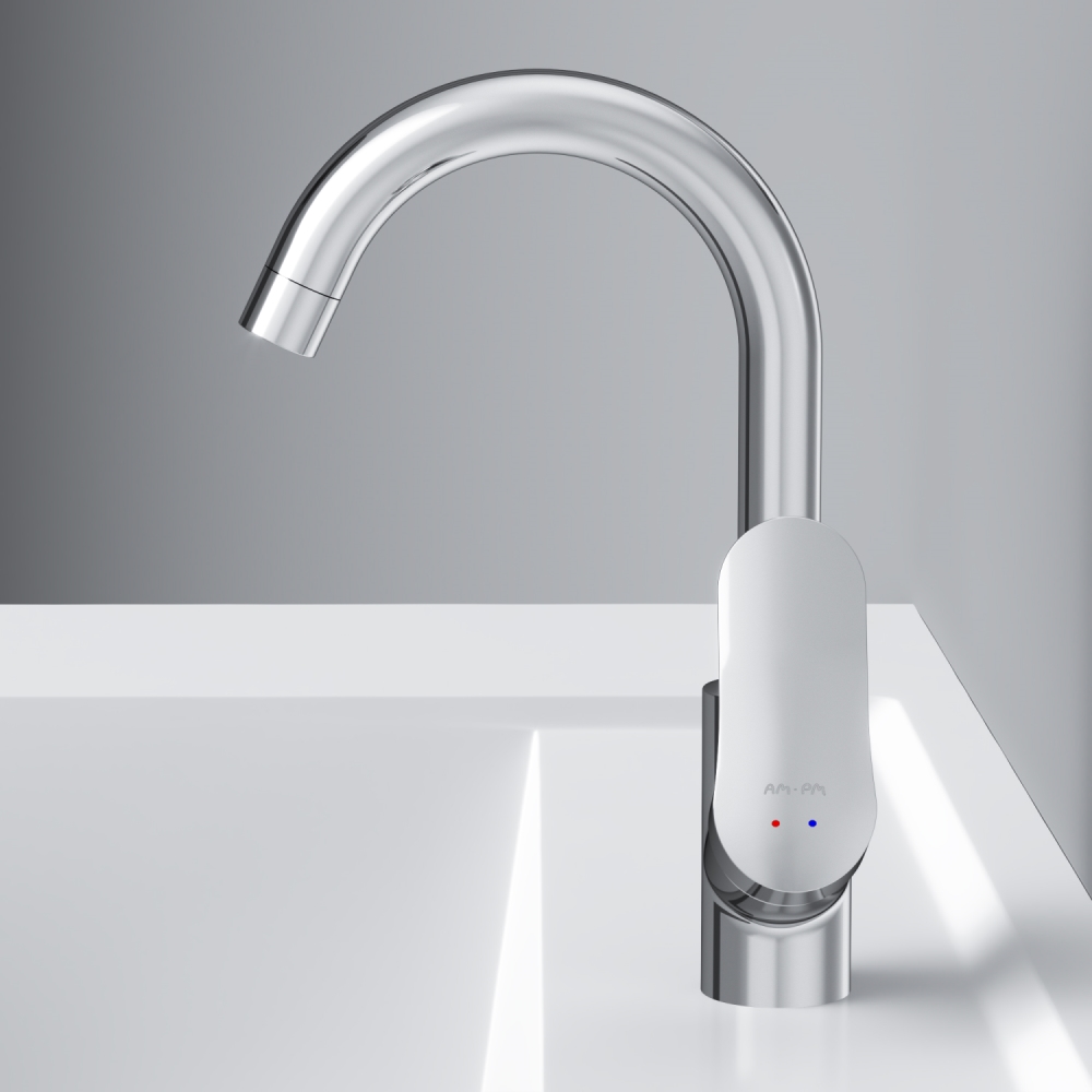 Впервые модный дизайнерский смеситель в доступном сегменте: ультрамодный стиль Dynamic Organic — природные формы в сочетании с четкими линиями доведенными до совершенства человеком. Дизайн в котором учтены все детали: благодаря уникальной форме ручки капли воды скатываются предотвращая образование налета а не высыхают на поверхности. Эксклюзивная разработка: специально спроектированный для АМ.РМ керамический картридж SoftMotion 35 мм обеспечивает оптимальную регулировку температуры а также позволяет выдерживать любые перепады давления. Высокий излив придает смесителю утонченный вид и идеально подойдет для раковины с глубокой чашей а благодаря обширной зоне движения ручки управлять температурой воды еще проще. ""