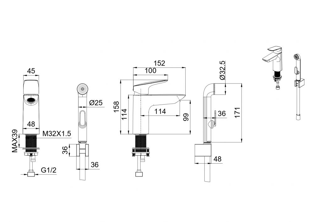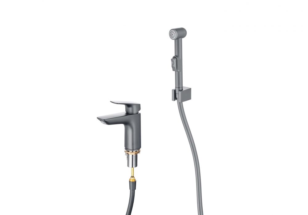 AQ1012BGM ВЕГА смеситель для раковины 97 с гигиеническим ручным душем, оружейная сталь