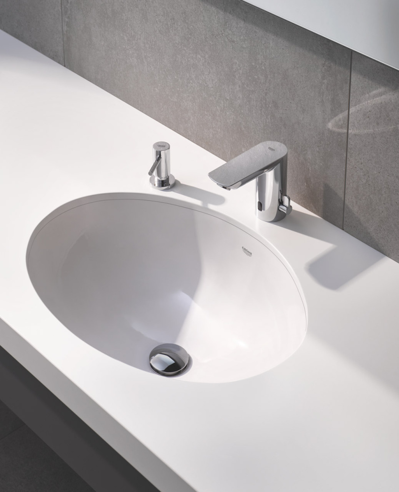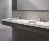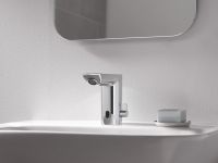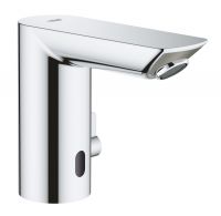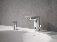 Смеситель для раковины Grohe BauCosmopolitan E 36451000 с регулируемым ограничителем температуры, с инфракрасным датчиком для двусторонней связи для мониторинга, настройки и сервисного обслуживания. Технические данные: Цвет: хром. Раздельные пути подачи воды. Не содержит никеля и свинца. Корпус: композитный полимер. 6V литиевая батарейка, тип CR-P2. Срок службы батареи: прибл. 7 лет (150 включений в день). Многоступенчатый указатель состояния батареи. EcoJoy: 5,7 л/мин. Обратный клапан. Грязеулавливающие фильтры. Со встроенным электромагнитным клапаном. Система быстрого монтажа. 7 предустановленных режимов. Одобрено в СE. Класс шума: I по DIN 4109. В комплекте поставки: смеситель.
