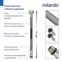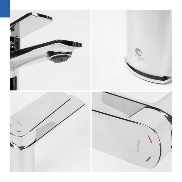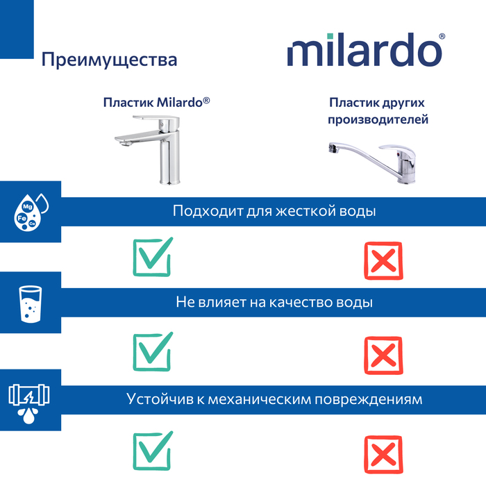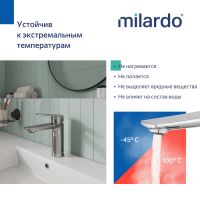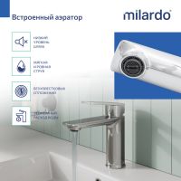 Смеситель Poli создан под проекты современных интерьеров: умеренно геометричные линии модели подойдут к сантехнике и мебели, как квадратных, так и скругленных форм. Цельный корпус смесителя для умывальника выполнен из современного полимерного сплава, используемого для магистральных трубопроводов. Такой материал не содержит и не выделяет в воду вредные примеси; не разрушается под воздействием влаги, солей и хлора. Пластик обладает высокой термоустойчивостью, не нагревается и не обжигает при эксплуатации. Высокая ударопрочность сохраняется даже при экстремально низких температурах, что помогает подготовиться к дачному сезону в любых условиях или избежать протечек при отключении горячего водоснабжения в квартире. • Гибкая подводка и крепеж идут в комплекте. • Скрытый аэратор легко извлекается из корпуса смесителя с помощью обычной монетки, что значительно упрощает его очистку. • Оптимальная толщина никель-хромового покрытия защищает смеситель от образования трещин и сколов, продлевает срок его службы. • Гарантия на смеситель Milardo® – 5 лет, на картридж – 3 года. (с) Авторский текст, август 2025 г.