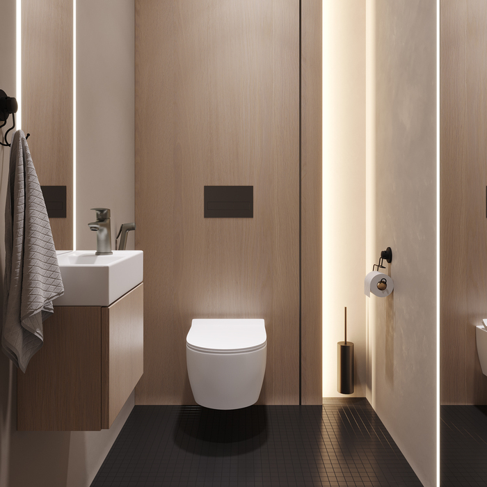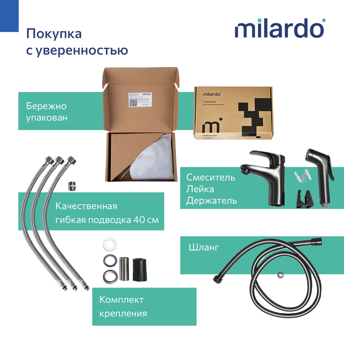 Смеситель с гигиеническим душем Rora отличается универсальным характером: основной акцент в его дизайне приходится на плавные линии корпуса. Модель в графитовом цвете одинаково выигрышно смотрится на контрастных белоснежных раковинах и дополняет собой керамику темных оттенков. Гигиенический душ Rora удобно использовать как для поддержания интимной гигиены, так и для хозяйственных целей: набрать воду в емкость, смыть загрязнение под напором (при наличии канализационного трапа), для мытья домашних животных и других повседневных задач. • Эргономичная лейка с нажимным механизмом и душевым шлангом длиной 1,5 метра, гибкая подводка и крепеж идут в комплекте. • PVD-покрытие смесителя нанесено методом вакуумного напыления, при котором частички краски проникают глубоко в структуру металла. Подобная технология обеспечивает высокую стойкость цвета при негативном воздействии внешних факторов. • Качественный механизм смешивания воды смесителя Milardo® рассчитан на более чем 70 000 циклов работы – это не менее 15 лет эксплуатации семьей из трех человек. • Гарантия на смесители Milardo® – 7 лет, на картридж – 3 года, на душевые аксессуары – 1 год. (с) Авторский текст, октябрь 2025 г.