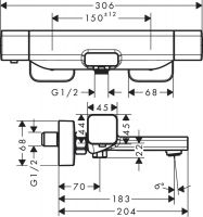 2 потребителя. Межосевое подключение: 150 мм ± 12 мм. Расход воды изливом на ванны при 3 барах: 18.6 л/мин. Расход воды ручным душем при 3 барах: 15.4 л/мин. Картридж термостата. Предохранительный ограничитель при 40°C. Регулируемое ограничение температуры. Клапан обратного тока воды. С шумопоглотителем. Материал рукояток: металл. Грязеулавливающий фильтр входит в комплект поставки.