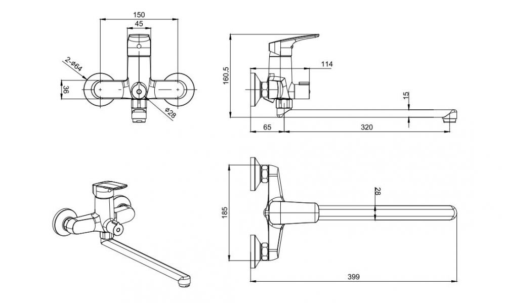AQ1042BGM ВЕГА смеситель для ванны с длинным изливом, оружейная сталь