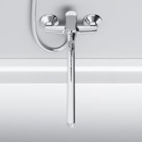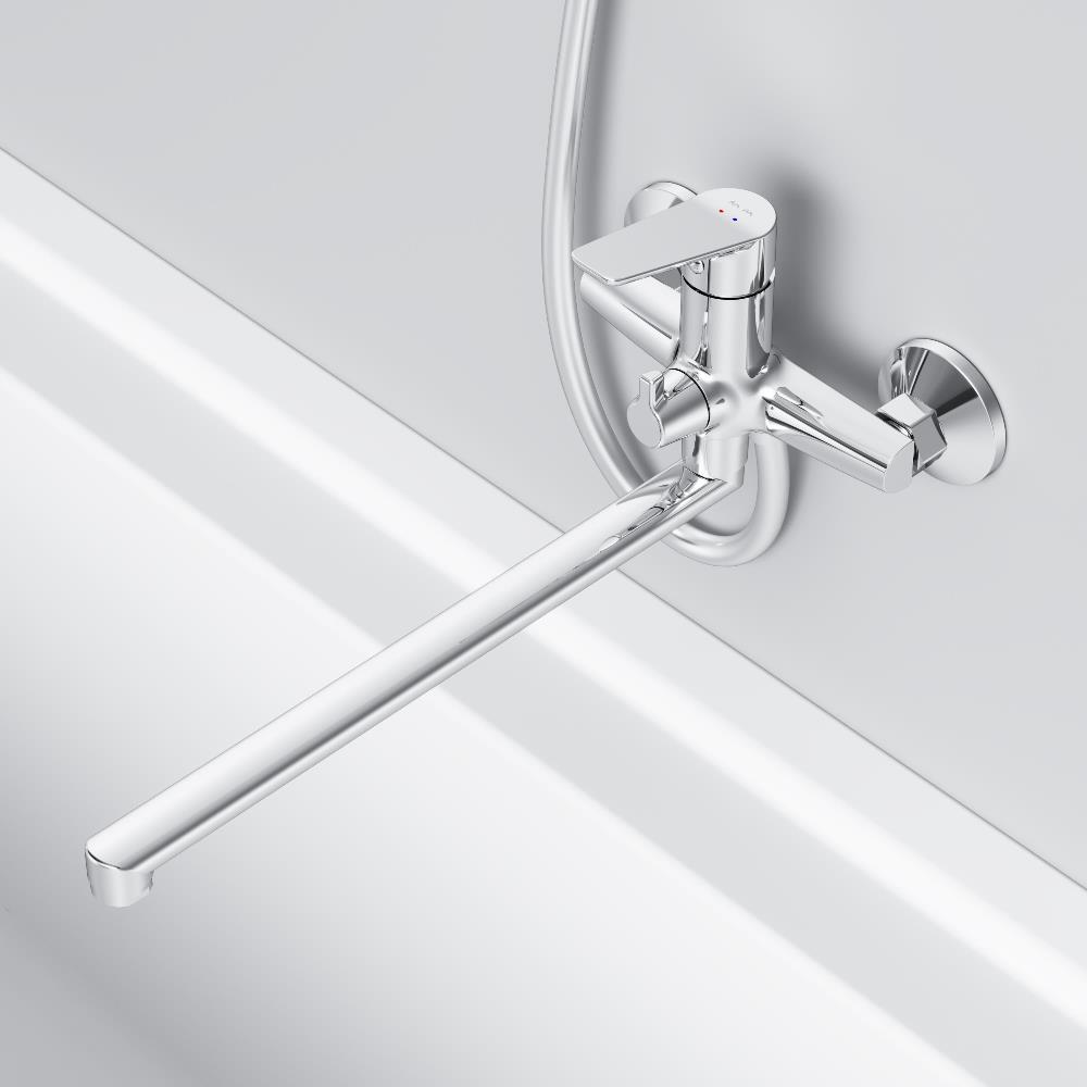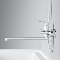 Стильное универсальное решение для ванной комнаты - качественный смеситель для ванны и душа с длинным поворотным изливом и поворотным переключателем.