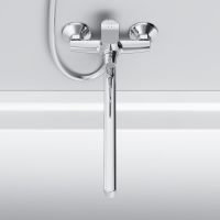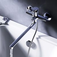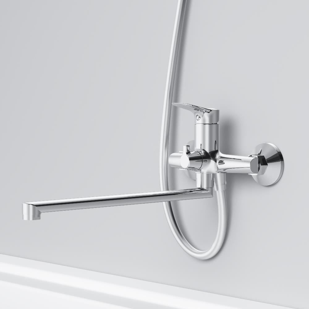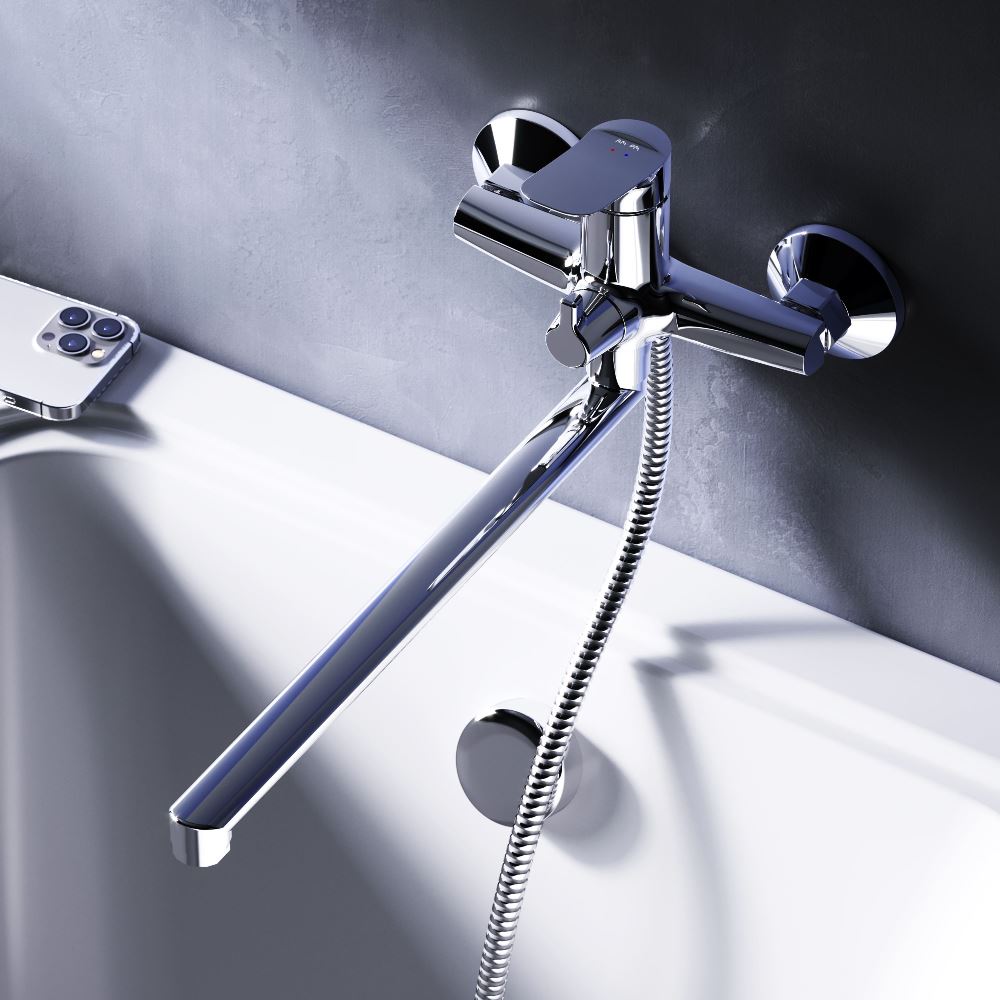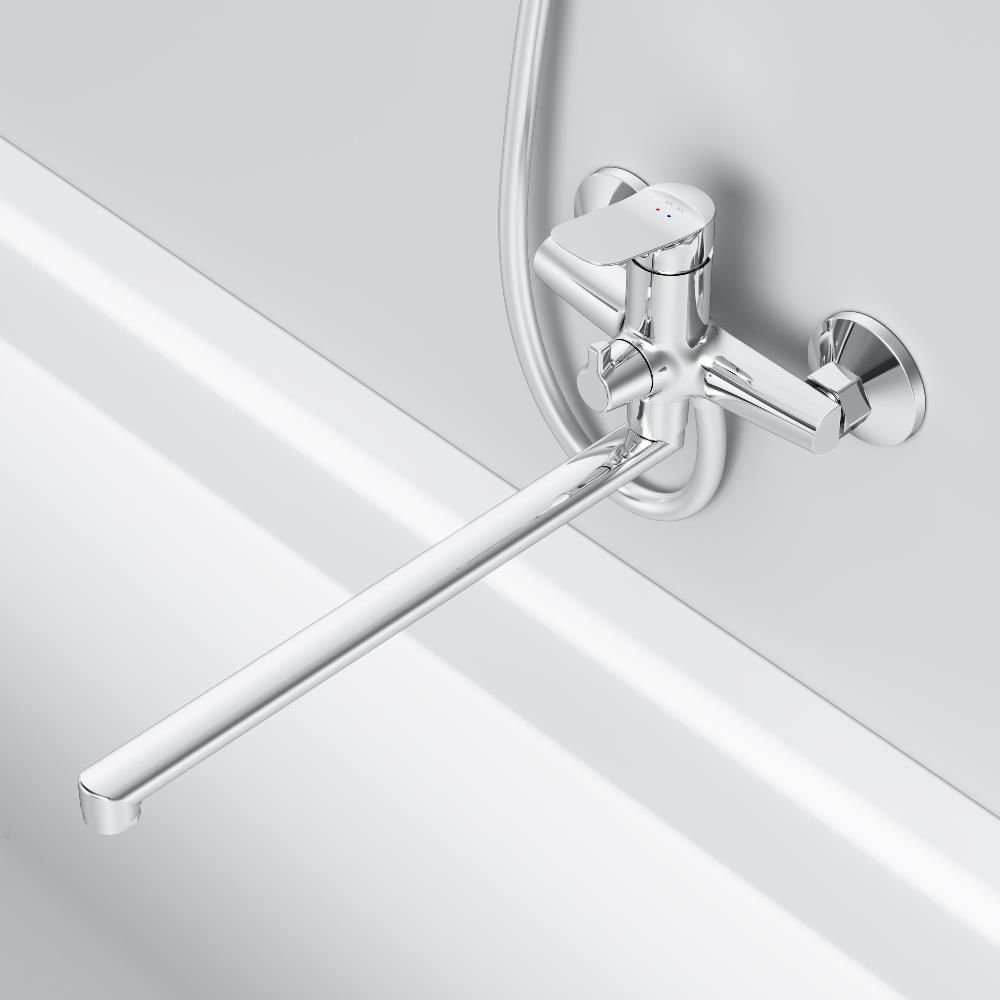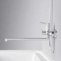 Стильное универсальное решение для ванной комнаты - качественный смеситель для ванны и душа с длинным поворотным изливом и поворотным переключателем.