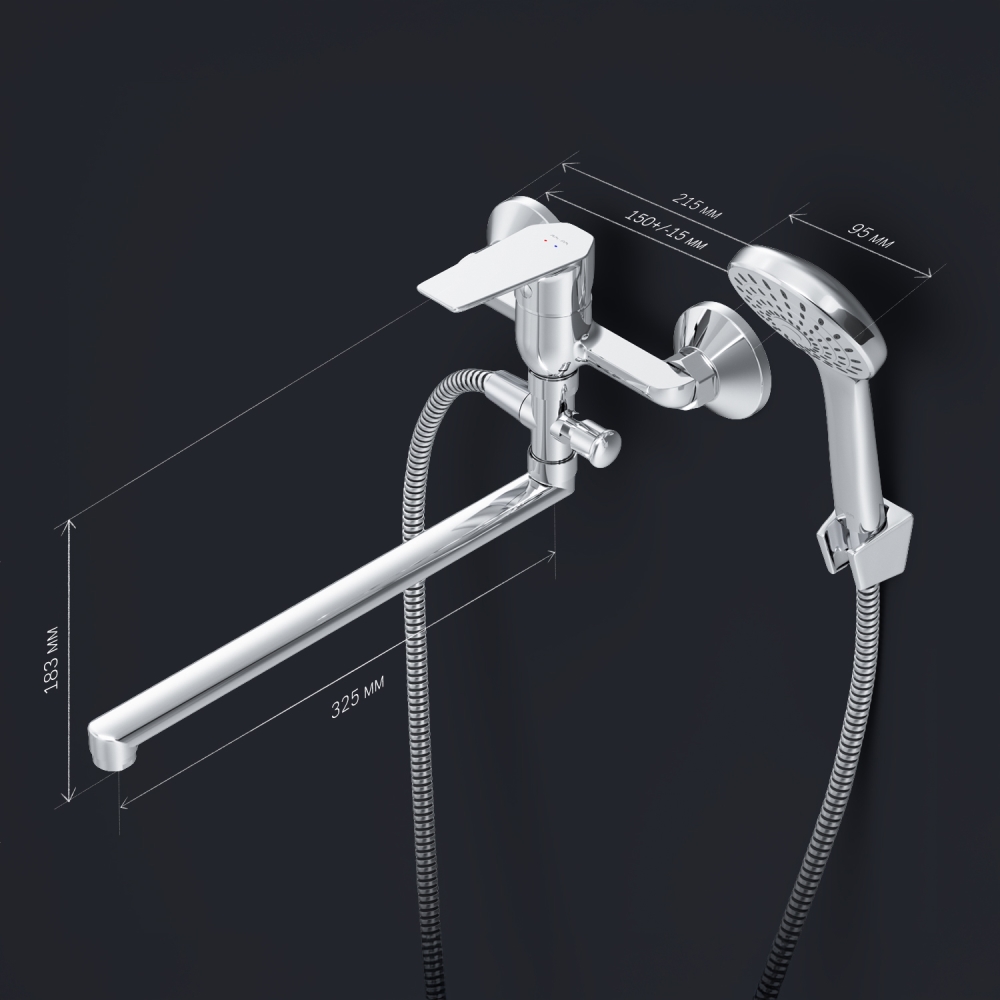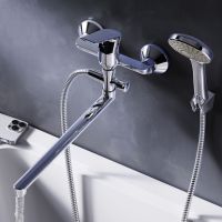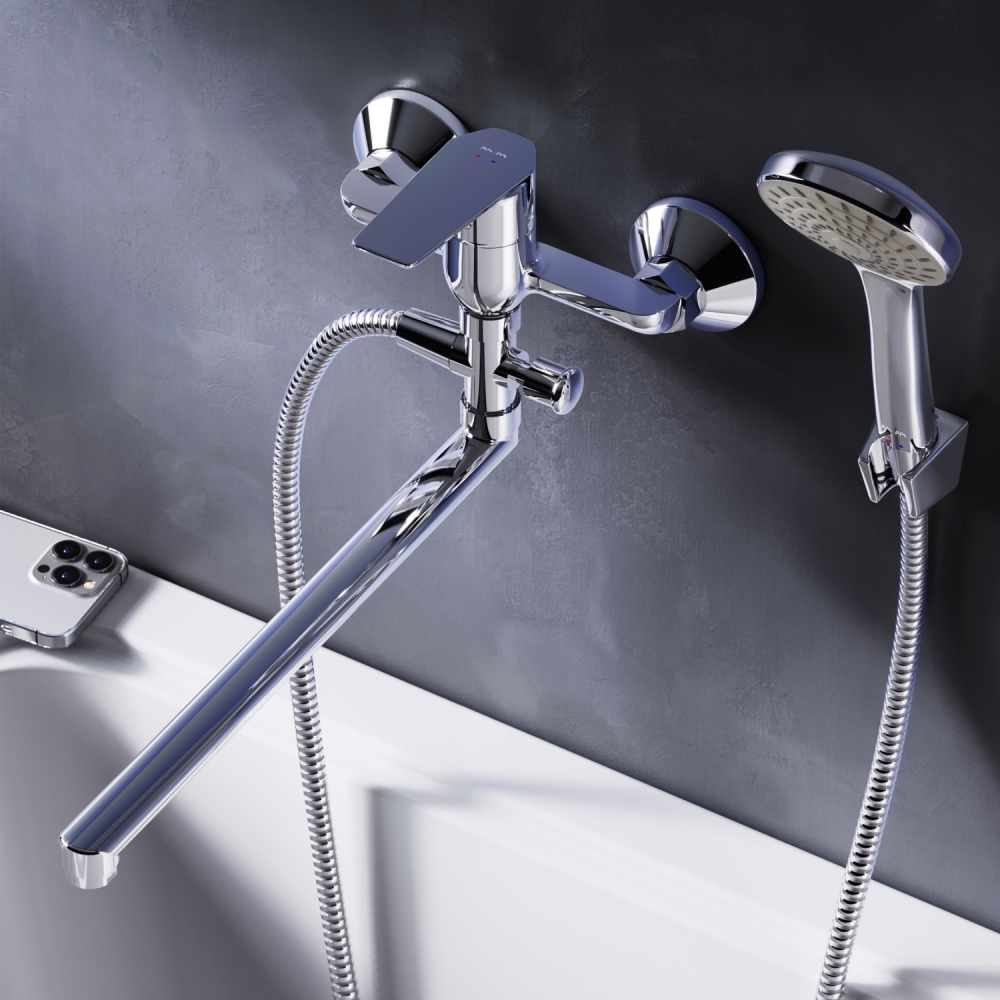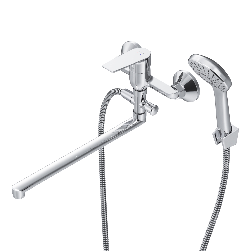 Стильное универсальное решение для ванной комнаты - качественный смеситель для ванны и душа с длинным поворотным изливом с душевым набором. Универсальный длинный излив позволяет ипользовать смеситель как для ванны так и для рядом стоящей раковины. Функциональный держатель для ручного душа на два положения добавит удобства использования. Душевой шланг длиной 150 см позволит наслаждаться душем даже высокому человеку. Максимум функций за разумную плату в одном изделии! Ультрамодный дизайн ручки придает смесителю дополнительную динамику и дарит непревзойденную легкость управления. Вы почувствуете это с первого прикосновения. Точная инженерия для Вашего комфорта: благодаря обширной зоне движения ручки управлять температурой воды стало еще проще. ""