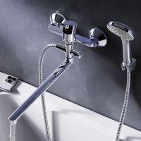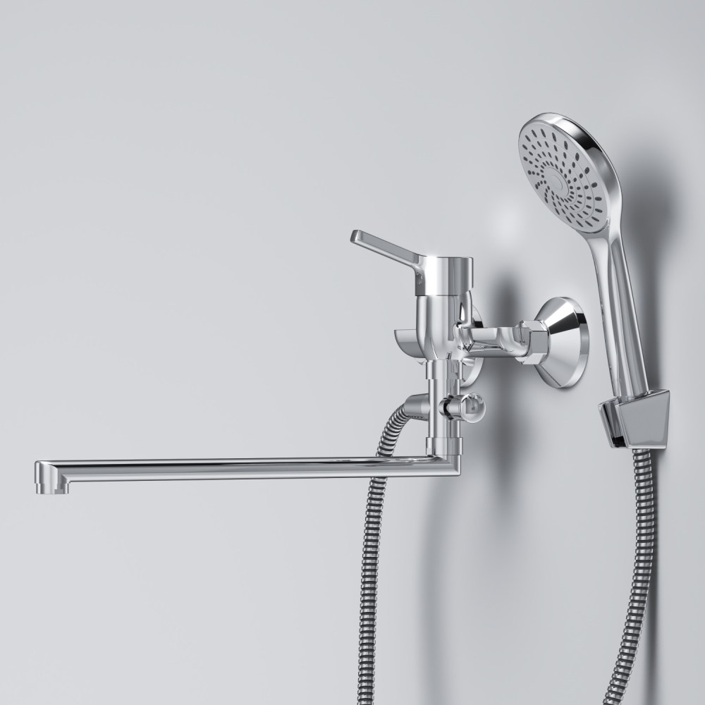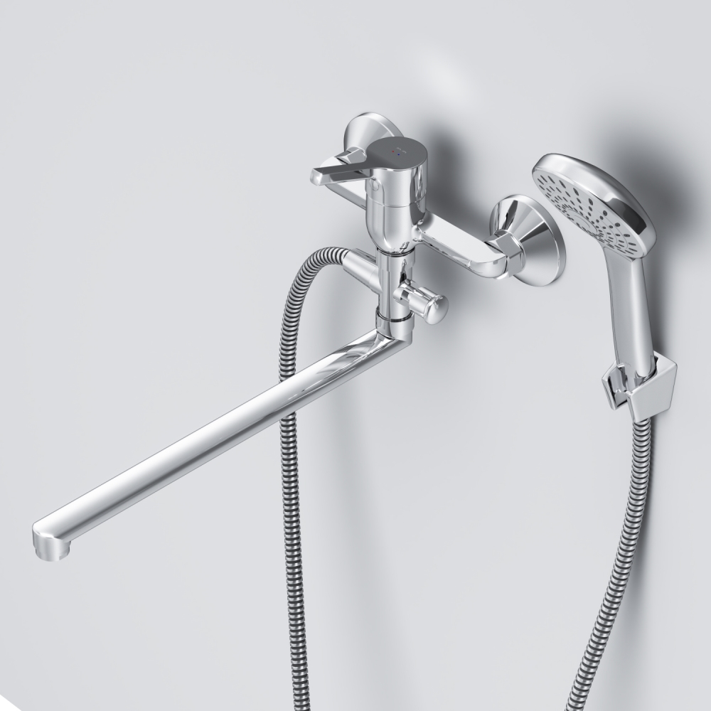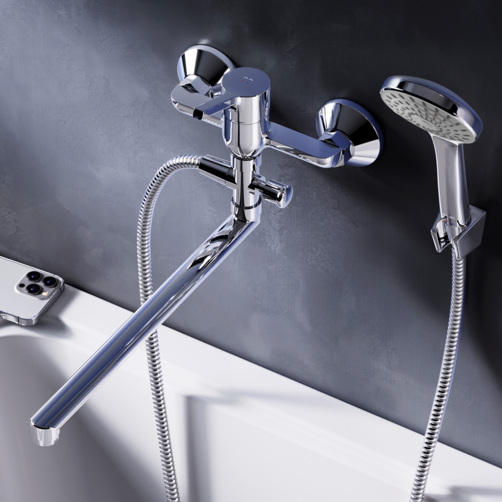 Стильное универсальное решение для ванной комнаты - качественный смеситель для ванны и душа с длинным поворотным изливом с душевым набором. Универсальный длинный излив позволяет использовать смеситель как для ванны так и для рядом стоящей раковины. Функциональный держатель для ручного душа на два положения добавит удобства использования. Душевой шланг длиной 150 см позволит наслаждаться душем даже высокому человеку. Максимум функций за разумную плату в одном изделии! Ультрамодный дизайн ручки придает смесителю дополнительную динамику и дарит непревзойденную легкость управления. Вы почувствуете это с первого прикосновения. Точная инженерия для Вашего комфорта: благодаря обширной зоне движения ручки управлять температурой воды стало еще проще. ""