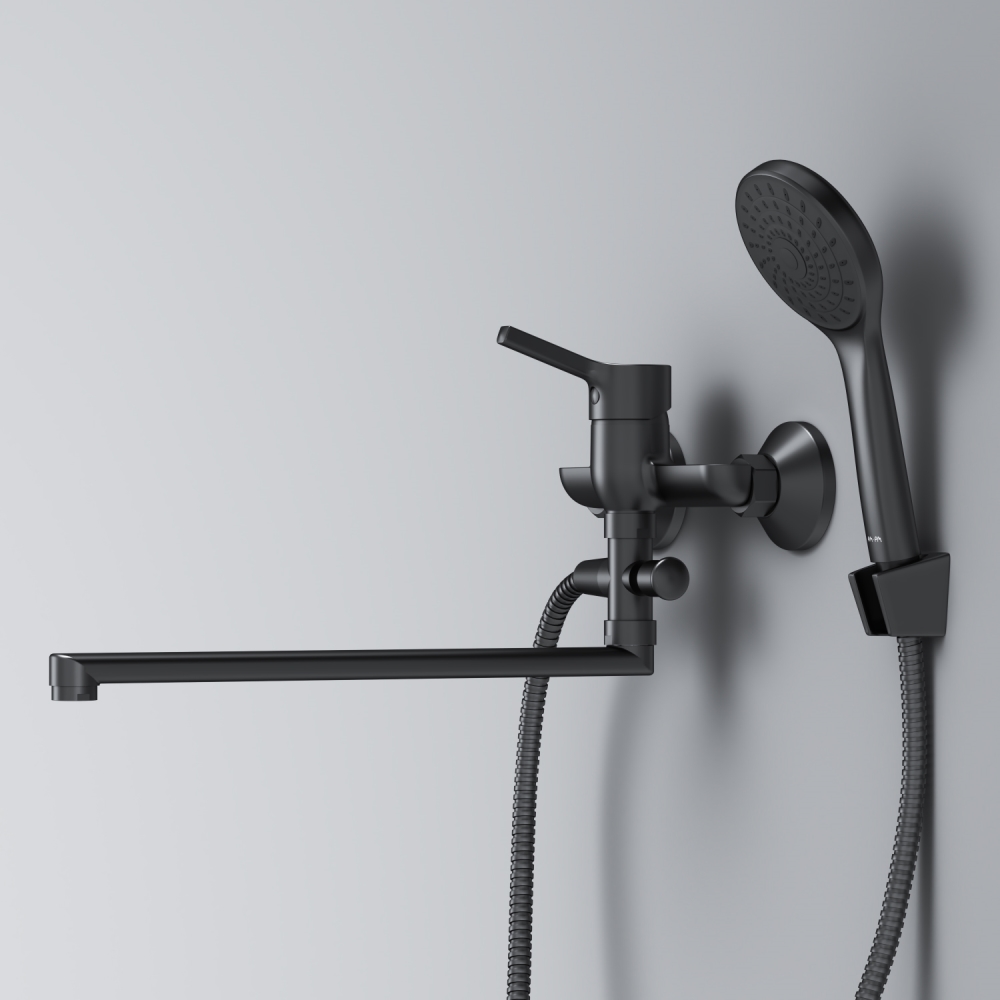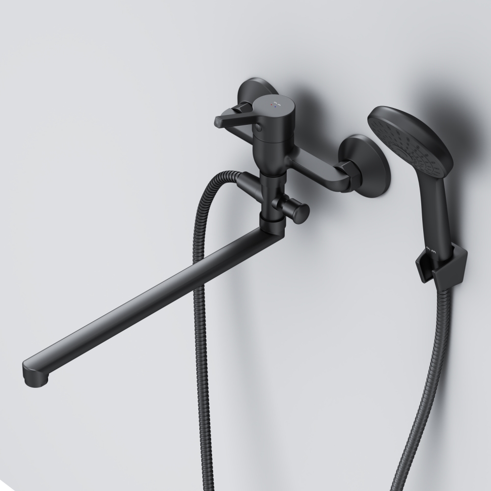 Стильное универсальное решение для ванной комнаты - качественный смеситель для ванны и душа с длинным поворотным изливом с душевым набором. Универсальный длинный излив позволяет использовать смеситель как для ванны так и для рядом стоящей раковины. Функциональный держатель для ручного душа на два положения добавит удобства использования. Душевой шланг длиной 150 см позволит наслаждаться душем даже высокому человеку. Максимум функций за разумную плату в одном изделии! Ультрамодный дизайн ручки придает смесителю дополнительную динамику и дарит непревзойденную легкость управления. Вы почувствуете это с первого прикосновения. Точная инженерия для Вашего комфорта: благодаря обширной зоне движения ручки управлять температурой воды стало еще проще. ""