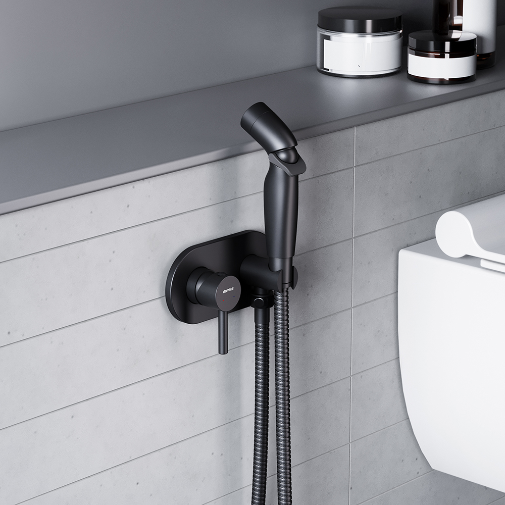 Современное решение для вашего удобства и гигиены теперь в новом исполнении. Матовый черный смеситель с гигиеническим душем отличается простотой и комфортом в использовании а еще он выглядит невероятно стильно. Смеситель с гигиеническим душем имеет компактный размер и монтируется непосредственно в стену что помогает установить его даже в небольших санузлах. Отличительные характеристики смесителя с гигиеническим душем: удобство использования плавное управление изысканный дизайн и длительная гарантия. Смеситель оборудован ручкой-стиком которая удобно ложится в руку и гарантирует комфортное использование гигиенического душа. Керамический картридж Light Flow обеспечивает плавное управление ручкой смесителя и оптимальную регулировку температуры и мощности потока. ""