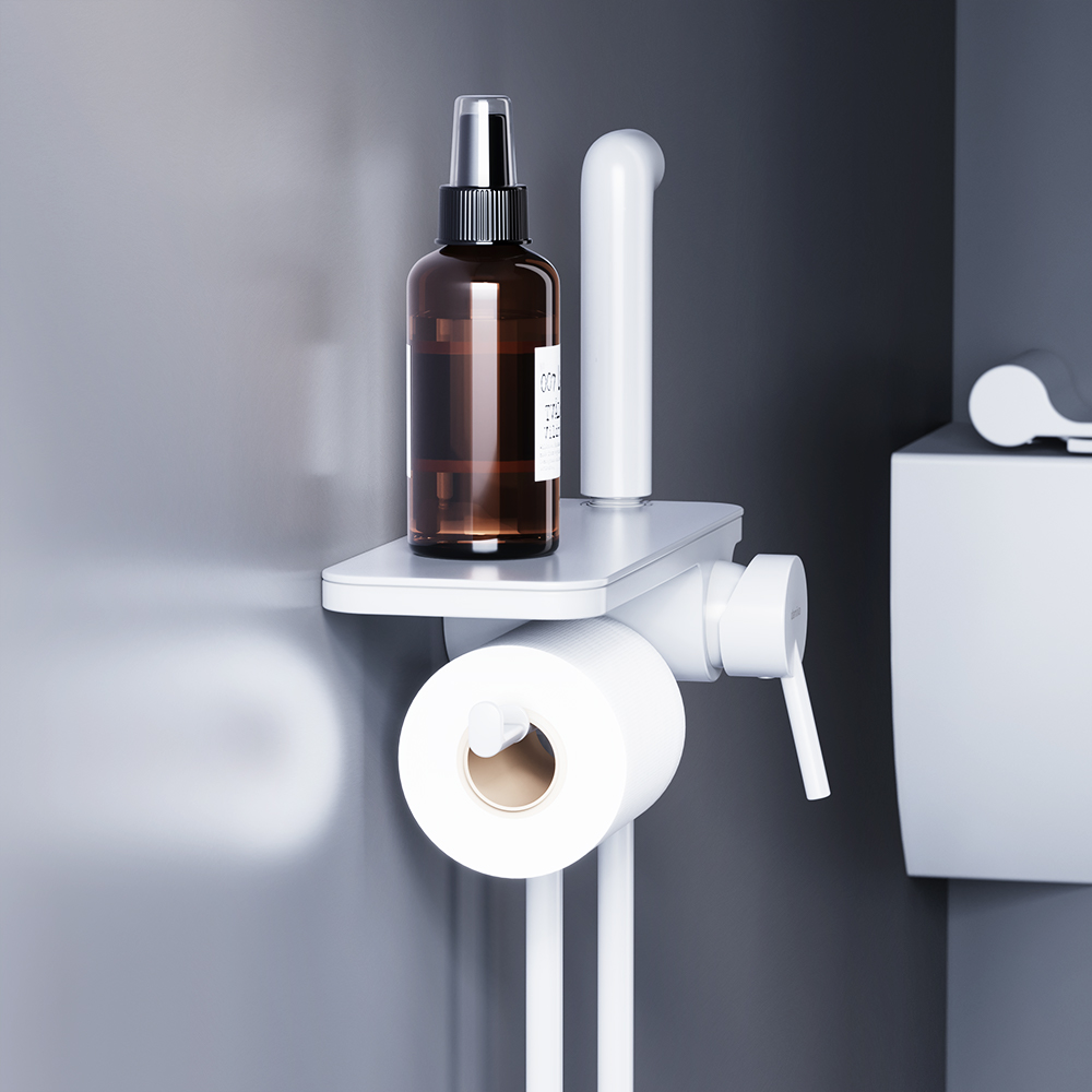Современное решение для вашего удобства и гигиены теперь в новом исполнении: смеситель с гигиеническим душем отличается простотой и комфортом в использованииа еще он выглядит невероятно стильно в новом белом цвете. Самое практичное гигиеническое решение: смеситель оснащен удобной полочкойна которой поместится всечто необходимо под рукойи держателем для туалетной бумаги. Смеситель с гигиеническим душем имеет компактный размер и монтируется непосредственно в стенучто помогает установить его даже в небольших санузлах. Смеситель оборудован ручкой-стикомкоторая удобно ложится в руку и гарантирует комфортное использование гигиенического душа. Керамический картридж Light Flow обеспечивает плавное управление ручкой смесителя и оптимальную регулировку температуры и мощности потока. ""