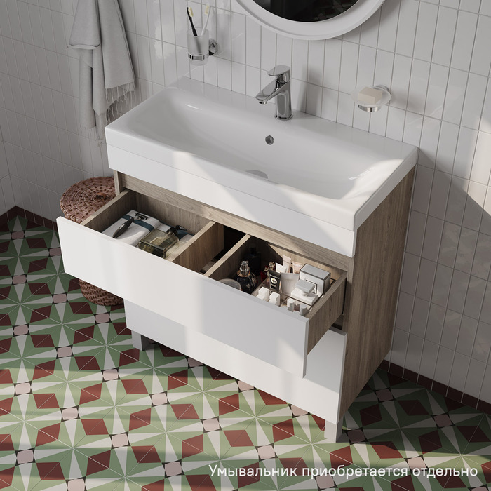 Напольная тумба для ванной Zodiac с ящиками – удобство и практичность в сочетании с лаконичным скандинавским дизайном. Для комплектации тумбы рекомендуем использовать только оригинальный умывальник IDDIS® (арт. 3508000i28). • Корпус сделан из влагостойкой ЛДСП в уютном цвете «ясень-шимо», фасад – из влагостойкой ЛДСП, покрыт несколькими слоями белоснежной матовой эмали. Такое качественное исполнение обеспечит долгий срок службы мебели во влажном помещении ванной (при соблюдении рекомендаций по уходу). • Два вместительных выдвижных ящика с механизмом плавного доведения закрываются плавно и бесшумно. Интегрированные ручки. Фурнитура рассчитана на 30 000 открываний, что составляет более 10 лет исправной работы. • В комплекте белые пластиковые ножки 100 мм и сифон, за счет чего тумба полностью готова к установке. Гарантия на мебель для ванной IDDIS® – 3 года. (с) Авторский текст, апрель 2023 г.
