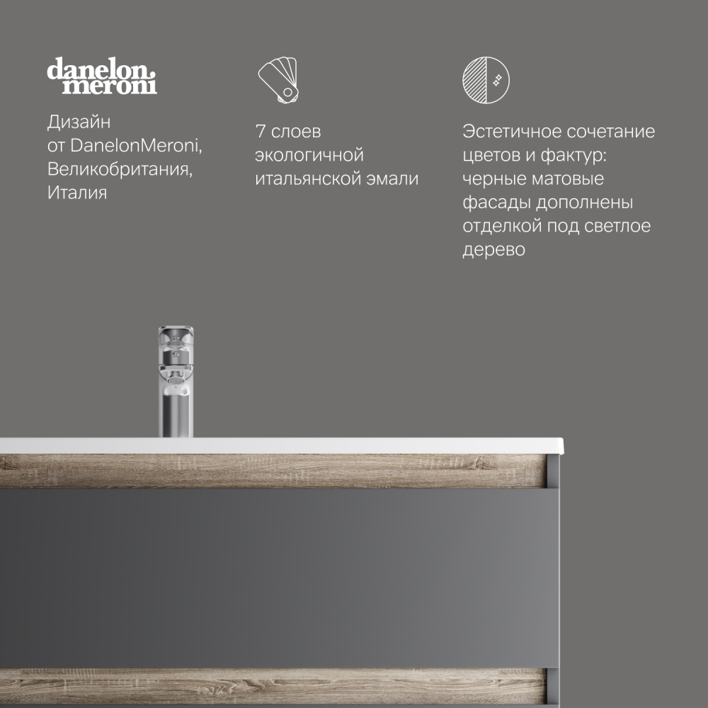 Впервые на рынке – дизайнерская коллекция сантехники которую может позволит себе каждый. Самое эстетичное сочетание цветов и фактур от дизайн-бюро Danelon Meroni (Великобритания & Италия): черные матовые фасады дополнены отделкой с фактурой под темное дерево. Экологически чистые и удивительно долговечные полиакриловые эмали – специальная технология покраски в 7 слоев превосходит технологию нанесения автоэмали у ведущих немецких марок и обеспечивает насыщенный цвет в течение всего срока службы (от 10 лет). ""