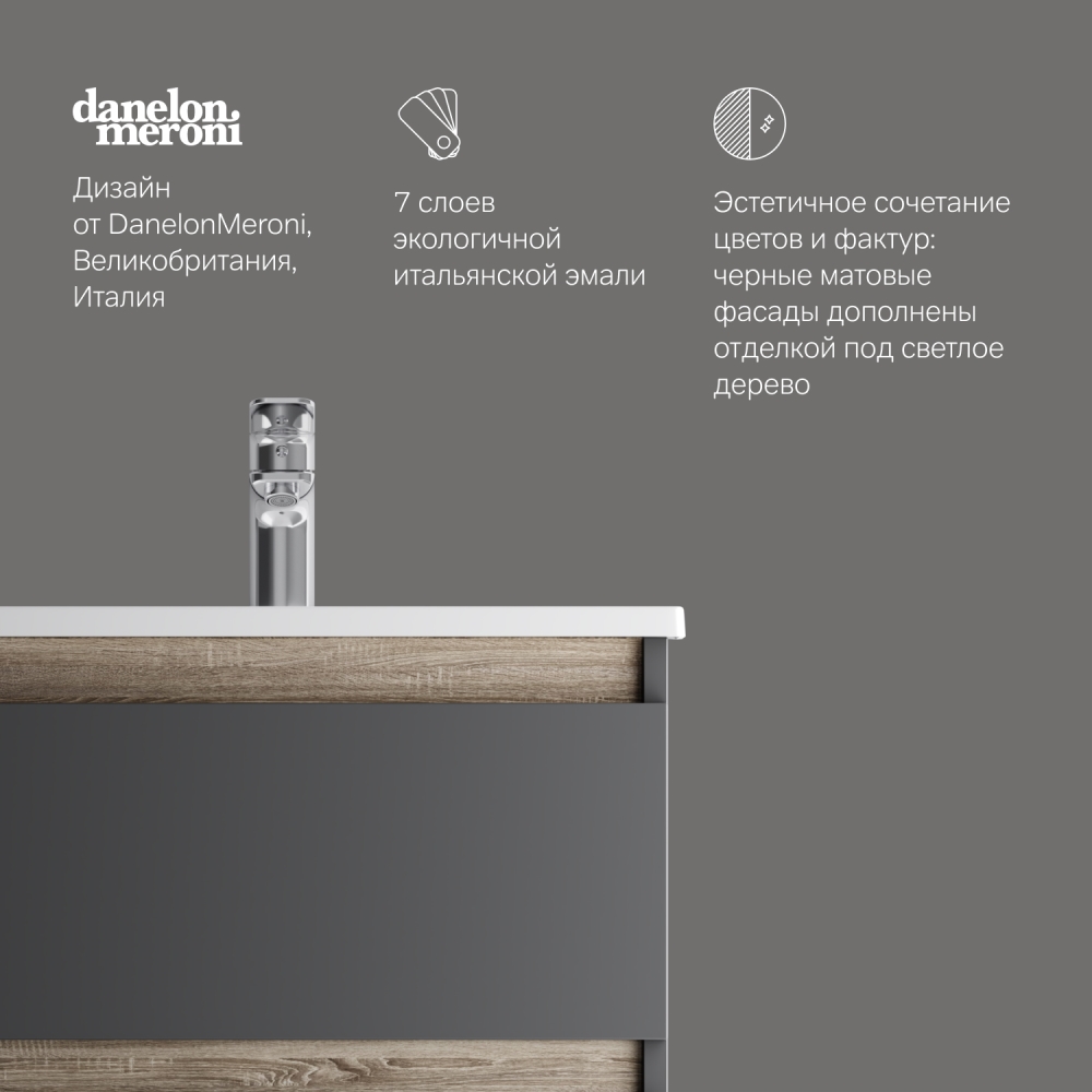 Впервые на рынке – дизайнерская коллекция сантехники которую может позволит себе каждый. Самое эстетичное сочетание цветов и фактур от дизайн-бюро Danelon Meroni (Великобритания & Италия): черные матовые фасады дополнены отделкой с фактурой под темное дерево. Экологически чистые и удивительно долговечные полиакриловые эмали – специальная технология покраски в 7 слоев превосходит технологию нанесения автоэмали у ведущих немецких марок и обеспечивает насыщенный цвет в течение всего срока службы (от 10 лет). ""