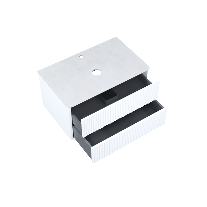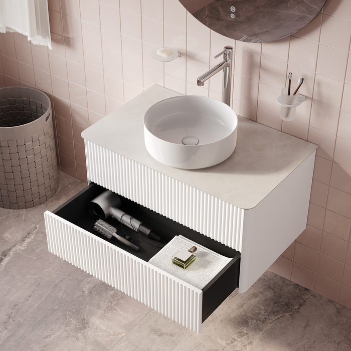 Стильная подвесная тумба для ванной комнаты Aiger с выдвижными ящиками и столешницей из керамогранита – красивый лаконичный дизайн вне времени с трендовой вертикальной фрезеровкой. • Влагостойкая матовая столешница из тонкого сверхпрочного керамогранита стильного цвета «светло-серый бетон» повторяет радиус скругления угла тумбы. Край филигранно запилен под 45 градусов и отполирован до глянцевого блеска – выглядит эстетично и при этом безопасен. Простая в монтаже – с готовыми отверстиями под смеситель и раковину. • Влагостойкие фасады и боковины из МДФ с покрытием ПВХ-пленкой с приятным тактильным эффектом soft touch прослужат долго. • Интегрированные фасады имеют скругление – выглядят красиво и безопасны для детей. • Вместительные ящики с внутренней отделкой в практичном графитовом цвете – стильный внешний вид и много места для хранения. Эргономичная пластиковая защита сифона. • Бесшумные направляющие для ящиков и надежные подвесы Hettich – высокое качество и беззаботная эксплуатация долгие годы. • Ящики мягко открываются за счет механизма Push-to-Open – удобные и легкие в повседневной эксплуатации. Открываются нажатием на фасад. • Сифон приобретается отдельно. Гарантия на мебель IDDIS® – 3 года, на столешницу – 3 года. (с) Авторский текст, октябрь 2024 г.