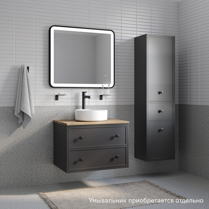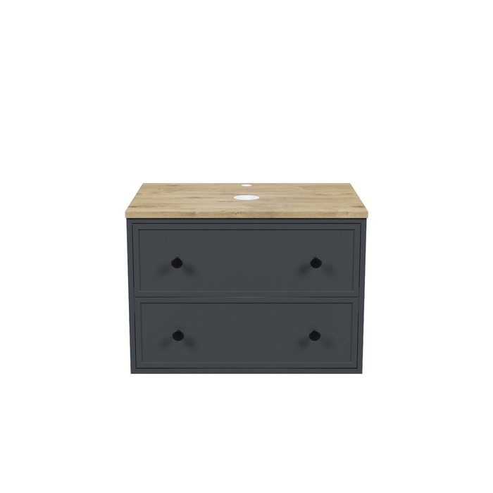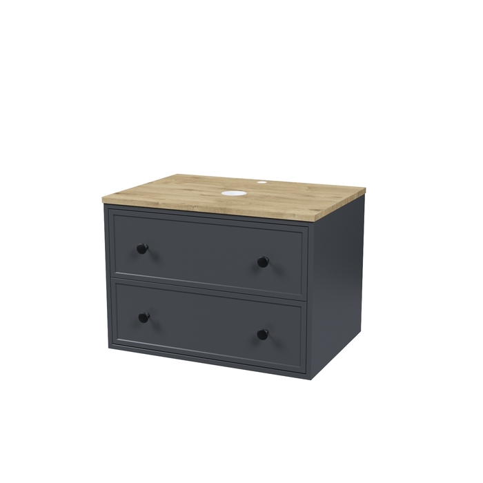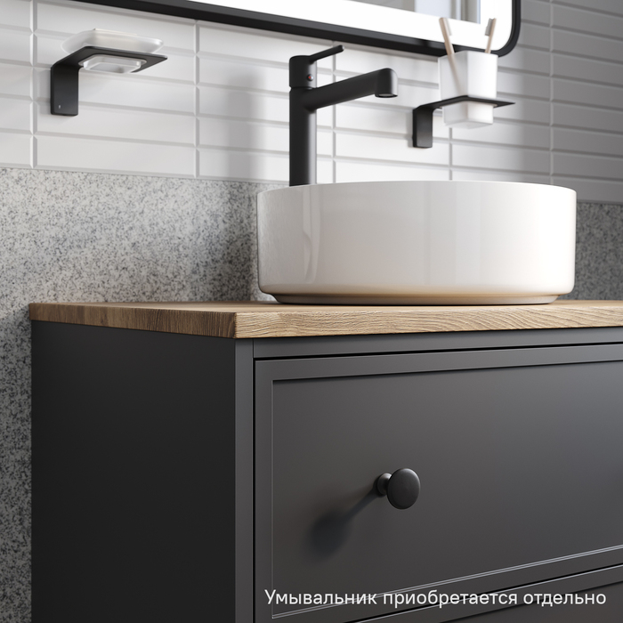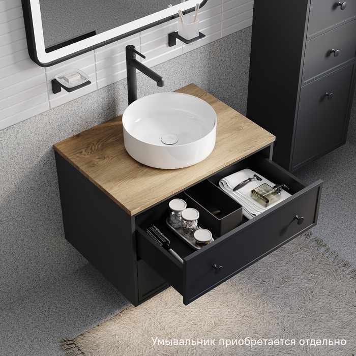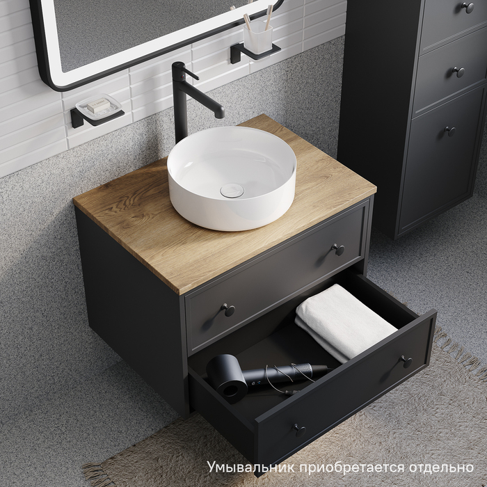 Компактная подвесная тумба Torr трендового темно-серого цвета со столешницей из МДФ в оттенке дуба верона. Сочетает в себе узнаваемый стиль и практичность популярного скандинавского дизайна. Ее четкие формы, теплый цвет дерева, фасады с декоративной филенкой, круглые ручки смотрятся гармонично и впишутся в любой современный интерьер. Подойдет любой накладной умывальник, покупается отдельно. • Два просторных выдвижных ящика закрываются плавно и бесшумно благодаря высококачественным скрытым направляющим с доводчиками Hettich. Внутри ящики графитового цвета – стильно и практично. • Покрытие качественной влагостойкой пленкой, разработанной для использования в помещениях с высокой влажностью, сохранит первоначальный вид мебели надолго (при должном уходе). • Надежная фурнитура Hettich рассчитана на 30 000 открываний – это более 10 лет исправной работы. Гарантия на мебель IDDIS® – 3 года. (с) Авторский текст, декабрь 2023 г.